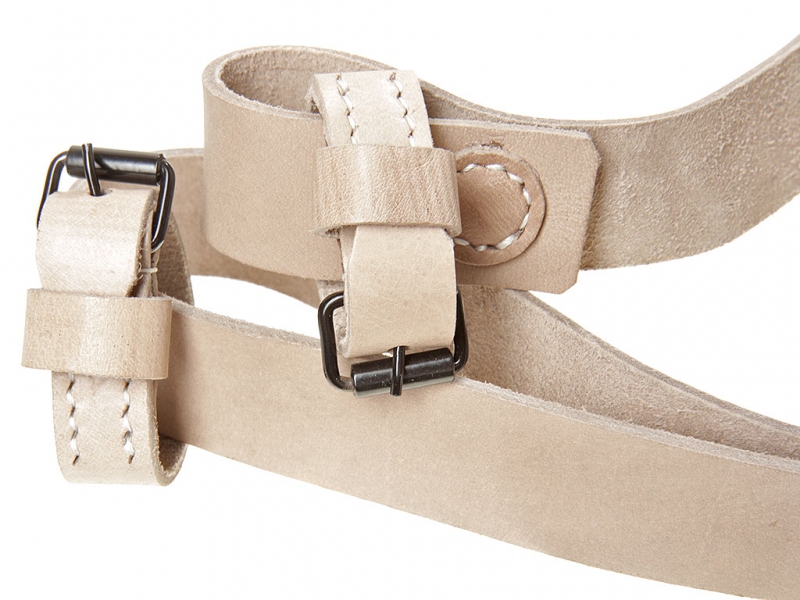 Кожа натурального цвета, латунная пряжка, латунный шпенек.