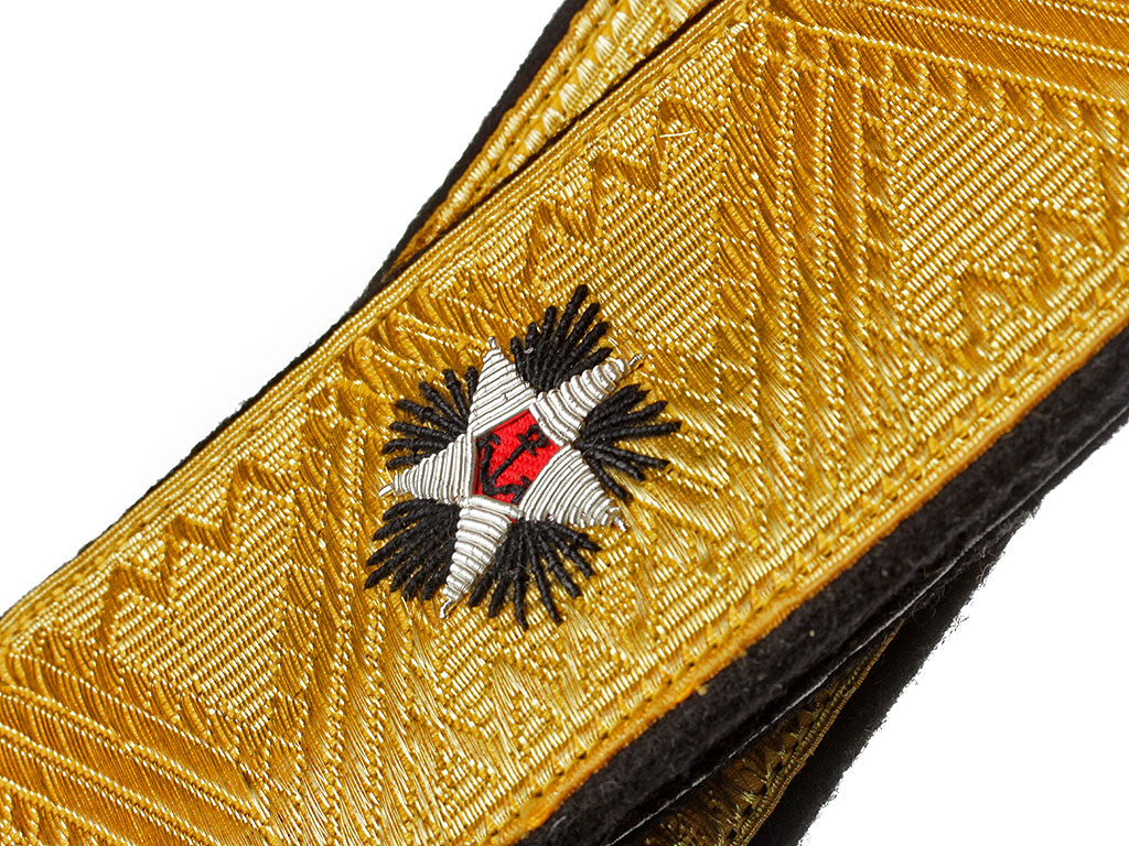 - для высшего командного состава корабельной и инженерно-корабельной служб— золотые, вышитые канителью, с выходящими из-под них пучками черных лучей и красными пятиугольниками, посередине на которых помещено черное изображения якоря;