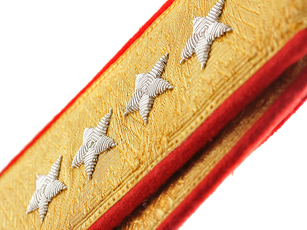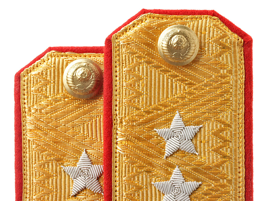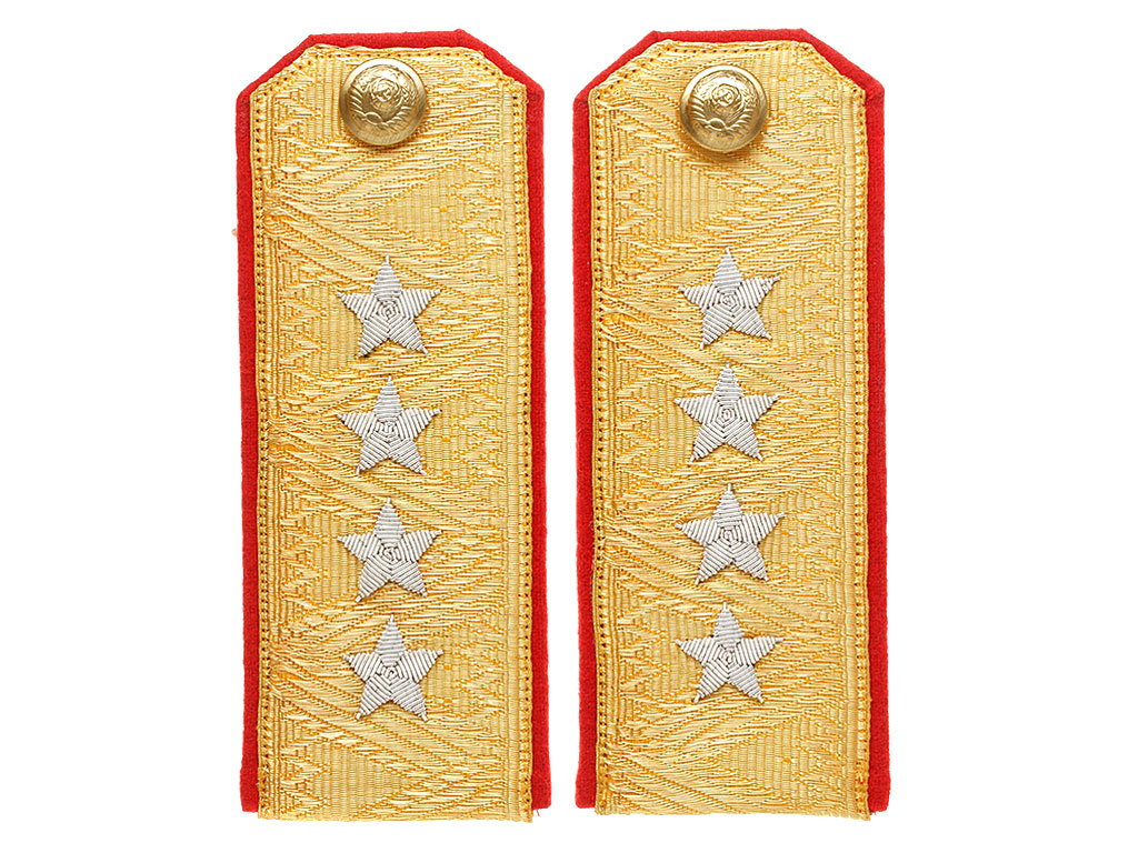 Пара повседневных погон образца 1943 года генерала армии. Золотое металлизированное поле с красным кантом, с четырьмя вертикально расположенными шитыми серебряными звездами. Пуговицы погонные латунные, с изображением Государственного герба СССР.
