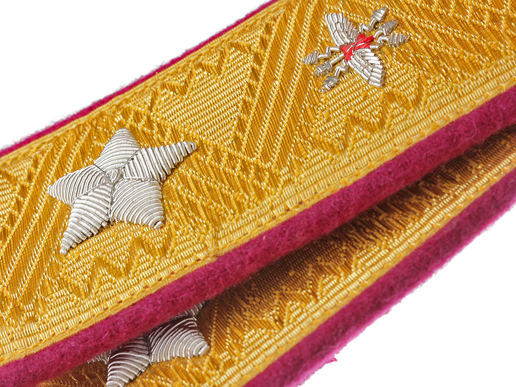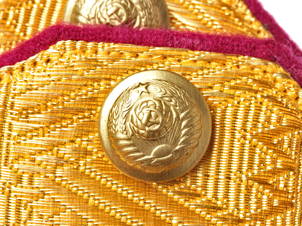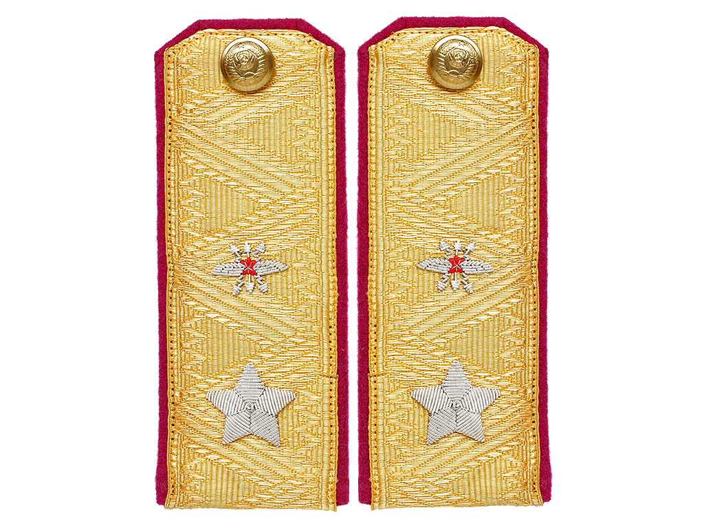 Пара повседневных погон образца 1943 года Главного маршала войск связи. Золотое металлизированное поле с малиновым кантом, с шитой серебряной звездой в лавровом венке и вышитым изображением скрещенных топоров над ним. Пуговицы погонные латунные, с изображением Государственного герба СССР.