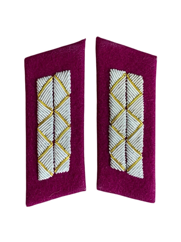 Копия парадных петлиц старшего офицерского состава интендантской и военно-юридической службы службы Красной Армии, на китель образца 1943 года. Изготовлены из приборного малинового сукна без окантовки. На петлицах серебряной тонкой канителью вышиты две полоски, перевитые зигзагообразно золотой канительной нитью. Проложены холстом. Длина петлиц в готовом виде - 7,5 см, ширина - 3 см. Данный вид петлиц был установлен Приказом НКО СССР №25 от 15 января 1943 года "О введении новых знаков различия для личного состава Красной Армии").