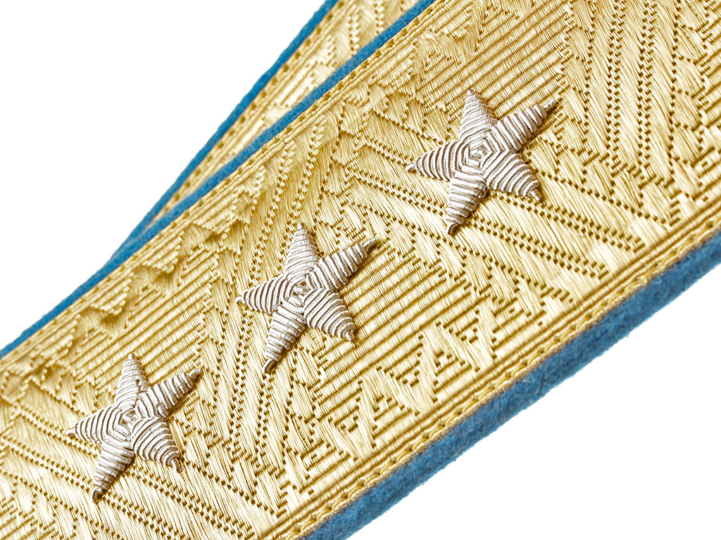 Звездочки на погонах генералов вышиты по золотому полю — серебром, по серебряному полю — золотом; количество звездочек соответствует военным званиям.
