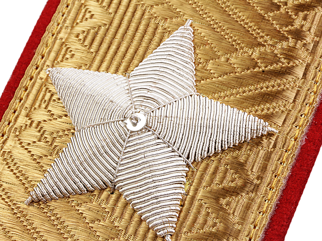 Поле галуна выполнено из латунной волоки, алая, подложка, шитая серебряной канителью звезда.