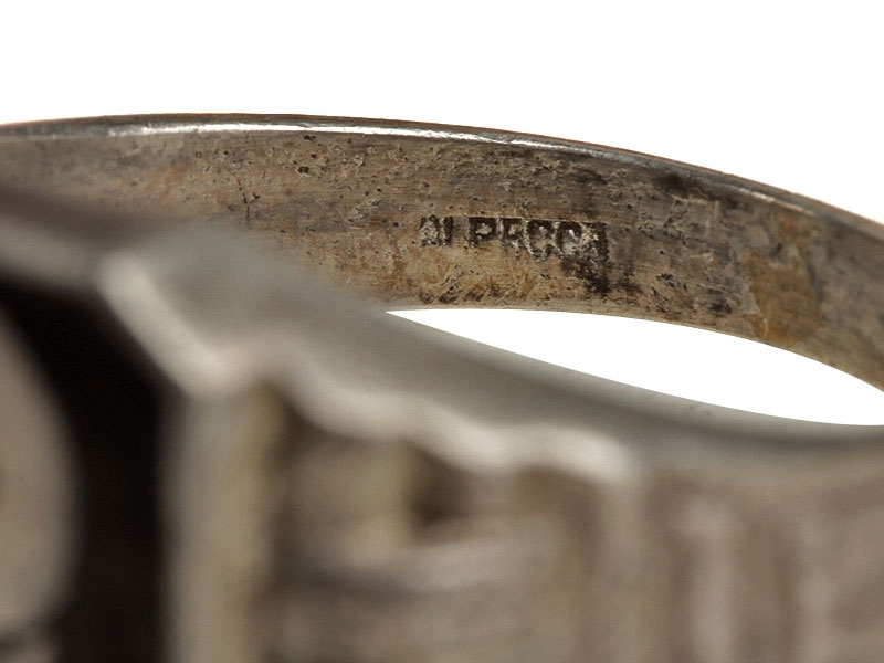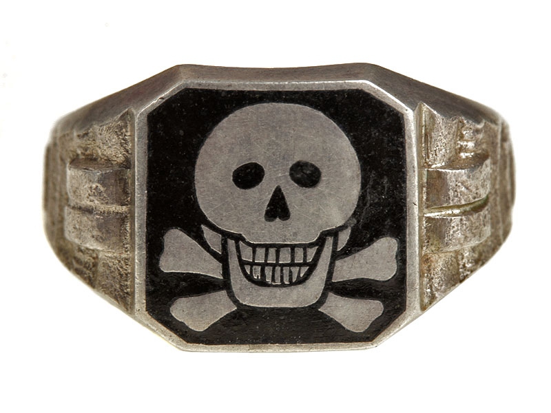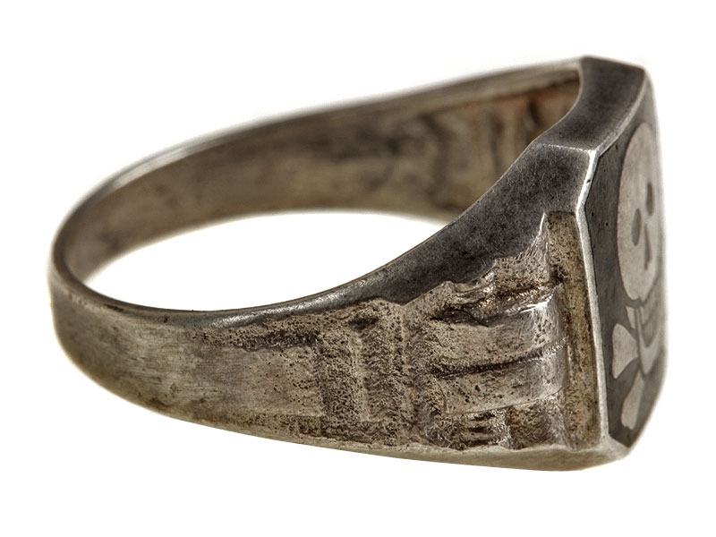 Перстень современного изготовления - копия известного германского перстня СС 1930-х годов с эмалевой черной площадкой, украшенной изображением черепа. Серебро.