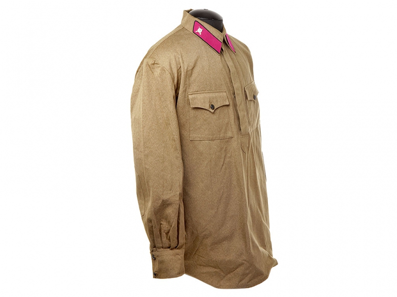 Гимнастерка была на 8 - 12 см длиннее рукава. Нагрудные карманы красноармейской пристрачивались по периметру, командирская обычно имела отлетные дутые карманы, часто со встречной складкой посередине, а иногда - с узкой байтовой. Воротник застегивался на крючки, планка чаще всего выполнялась закрытой. Манжеты рукавов и клапаны нагрудных карманов застегивались на малые форменные пуговицы желтого металла со звездочкой. Рукава красноармейских гимнастерок упрочнялись пятиугольными налокотниками.