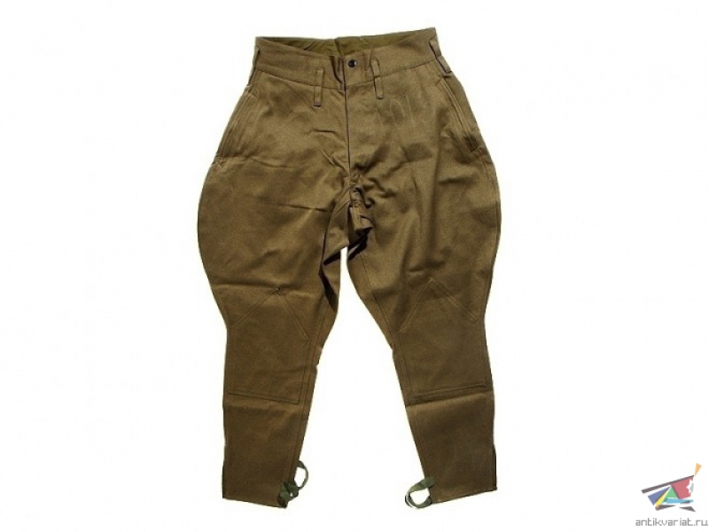 Командирские бриджи имели расширенный силуэт средней части, два поясных затяжника, реже - один затяжной задний хлястик. Складку-стрелку на бриджах не заглаживали. Штрипки штанин - на пуговицах, пояс - со шлевками для ремня или в виде высокого строченого корсажа. Красноармейские шаровары без кантов затягивались на задний хлястик. Боковые карманы и часовой кармашек-пистон имелись и на красноармейских брюках, но задний карман - только на командирских. Шаровары были с пятиугольными наколенниками, штанины завязывались на тонкие тесемки. Силуэт и конструкция шаровар почти не изменялись до конца 60-х гг.