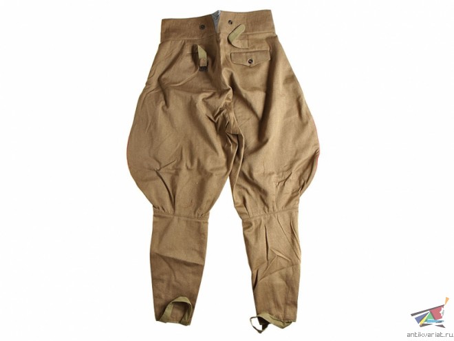Командирские бриджи имели расширенный силуэт средней части, два поясных затяжника, реже - один затяжной задний хлястик. Складку-стрелку на бриджах не заглаживали. Штрипки штанин - на пуговицах, пояс - со шлевками для ремня или в виде высокого строченого корсажа. Красноармейские шаровары без кантов затягивались на задний хлястик. Боковые карманы и часовой кармашек-пистон имелись и на красноармейских брюках, но задний карман - только на командирских. Шаровары были с пятиугольными наколенниками, штанины завязывались на тонкие тесемки. Силуэт и конструкция шаровар почти не изменялись до конца 60-х гг.