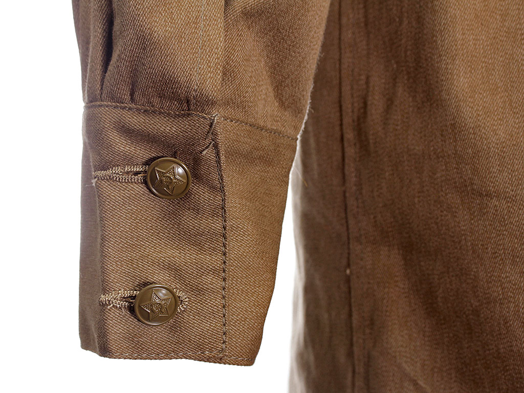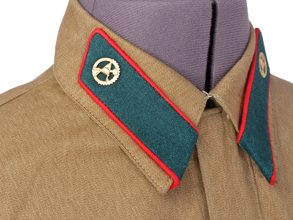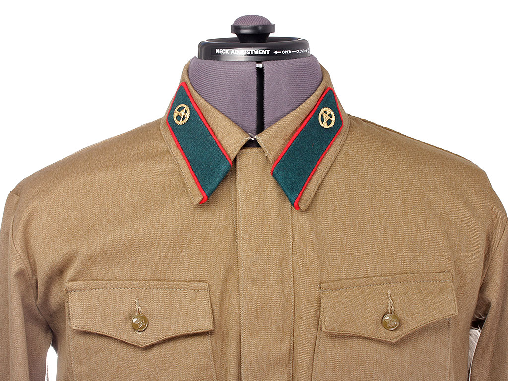 Копия высокого качества, ткань максимально приближена к оригиналу по качеству изготовления и фактуре. При изготовлении петлиц также в качестве образца были использованы оригинальные петлицы (цветные петлицы по роду войск носились до августа 1941 года, с сентября 1941 по февраль 1943 года использовались петлицы защитного цвета). Петличные знаки (эмблемы) изготовлены штампом и практически полностью повторяют оригинал. При желании на петлицы можно установить также знаки различия младшего командного состава РККА.