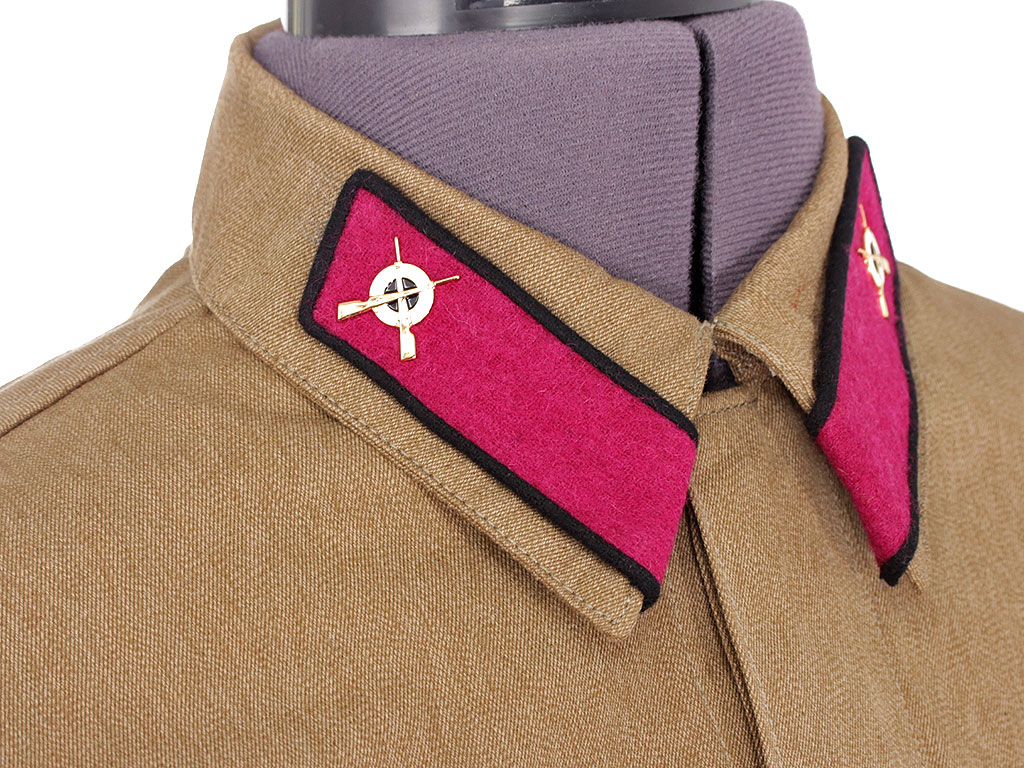 Копия высокого качества, ткань максимально приближена к оригиналу по качеству изготовления и фактуре. При изготовлении петлиц также в качестве образца были использованы оригинальные петлицы (цветные петлицы по роду войск носились до августа 1941 года, с сентября 1941 по февраль 1943 года использовались петлицы защитного цвета). Петличные знаки (эмблемы) изготовлены штампом и практически полностью повторяют оригинал. При желании на петлицы можно установить также знаки различия младшего командного состава РККА.