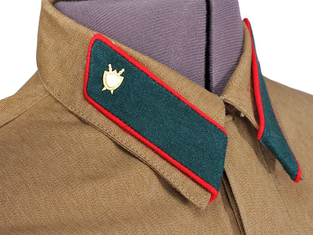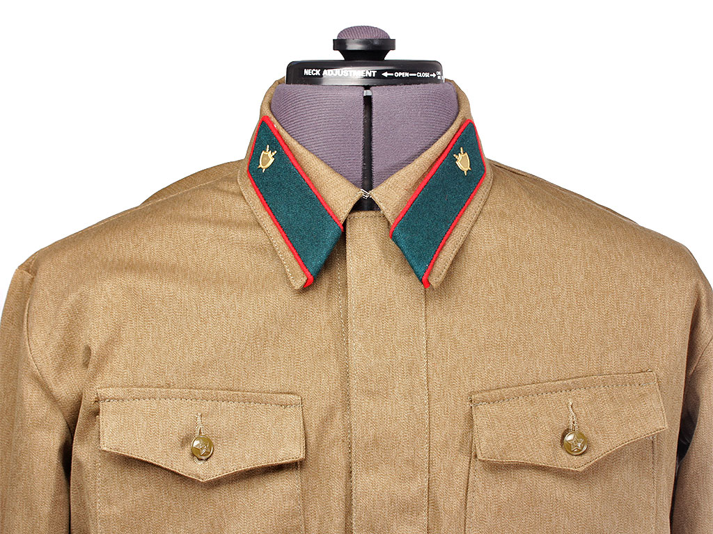 Копия высокого качества, ткань максимально приближена к оригиналу по качеству изготовления и фактуре. При изготовлении петлиц также в качестве образца были использованы оригинальные петлицы (цветные петлицы по роду войск носились до августа 1941 года, с сентября 1941 по февраль 1943 года использовались петлицы защитного цвета). Петличные знаки (эмблемы) изготовлены штампом и практически полностью повторяют оригинал. При желании на петлицы можно установить также знаки различия младшего командного состава РККА.