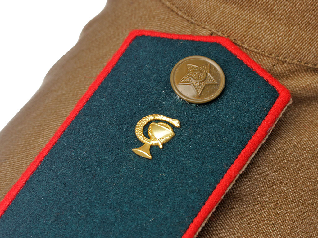 Летняя полевая хлопчатобумажная гимнастерка Рабоче Крестьянской Красной Армии (РККА) образца 1943 года с эмблемами медицинской службы образца 1936/43 года и галифе в комплекте.