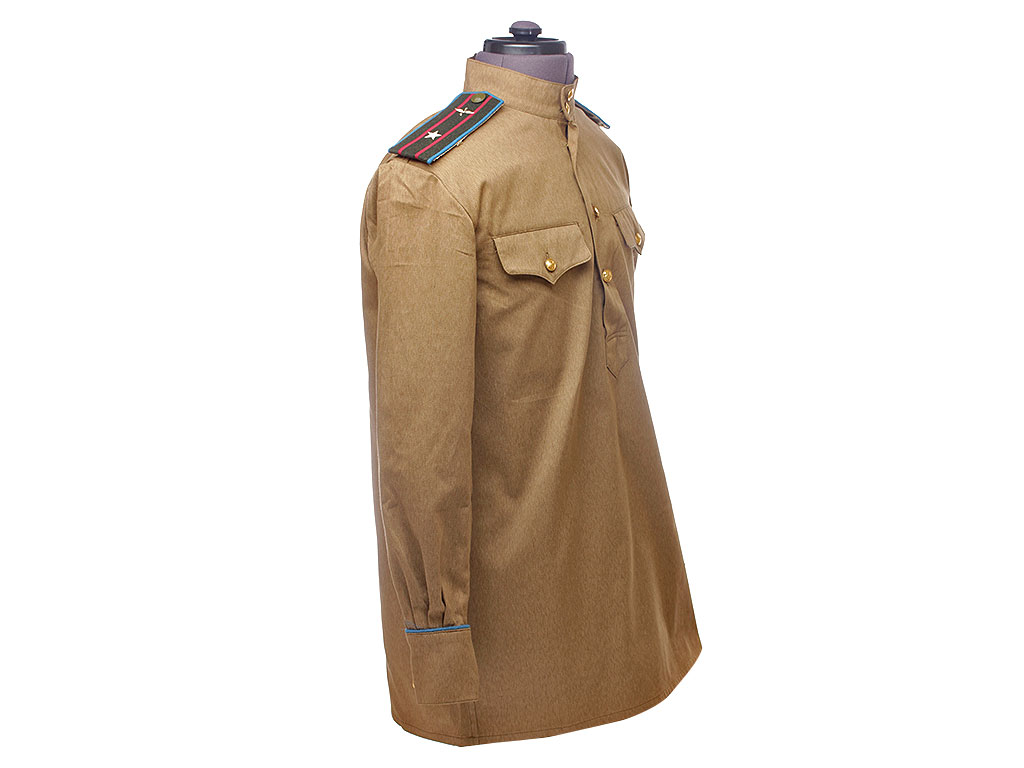 Гимнастерка (летняя рубаха) введена Приказом Народного Комиссара Обороны СССР № 25 от 15 января 1943 года. Изготовлена из хлопчатобумажной ткани защитного цвета со стоячим мягким воротником, застегивающимся на две форменные пуговицы малого размера через сквозные петли. На плечах пристегнуты погоны установленного образца. Рубаха имеет нагрудную планку с застежкой на три пуговицы и два нагрудных прорезных (встроенных) кармана с клапанами на одной пуговице (т.к. это гимнастерка начсостава - у рядового состава карманы на 1943 год отсутствуют). Рукава имеют обшлага с двумя пуговицами. Обшлага имеют цветной кант (в данном случае - голубого цвета). Такой же кант имеют и галифе.