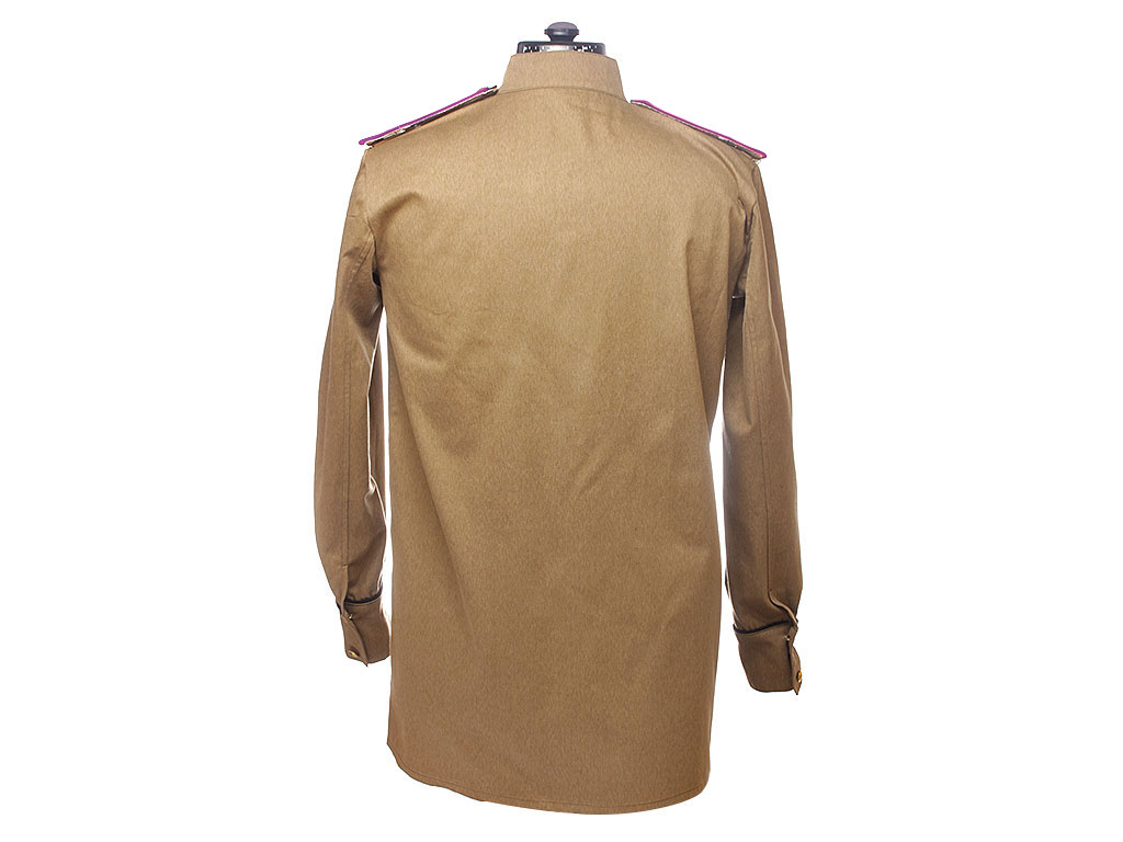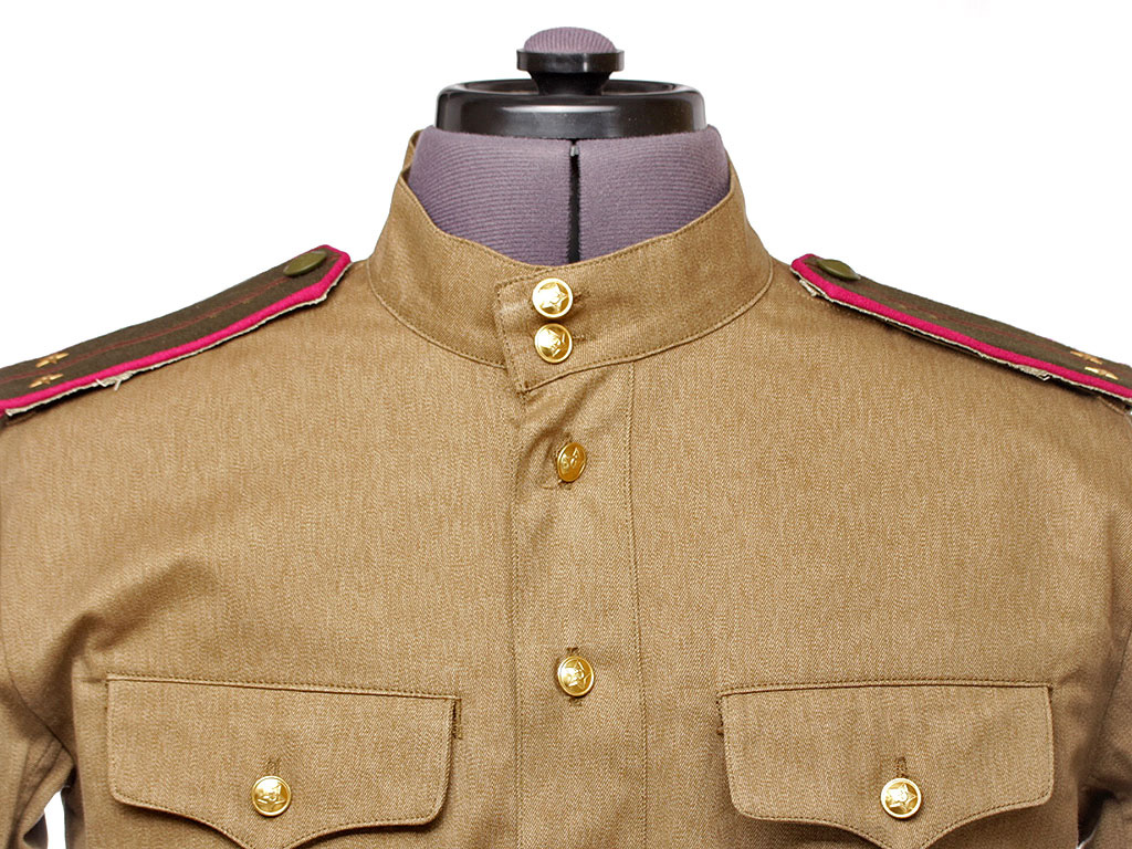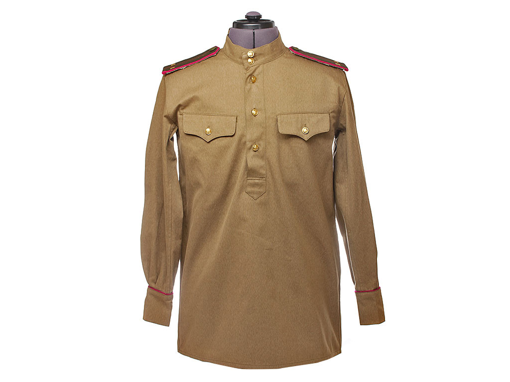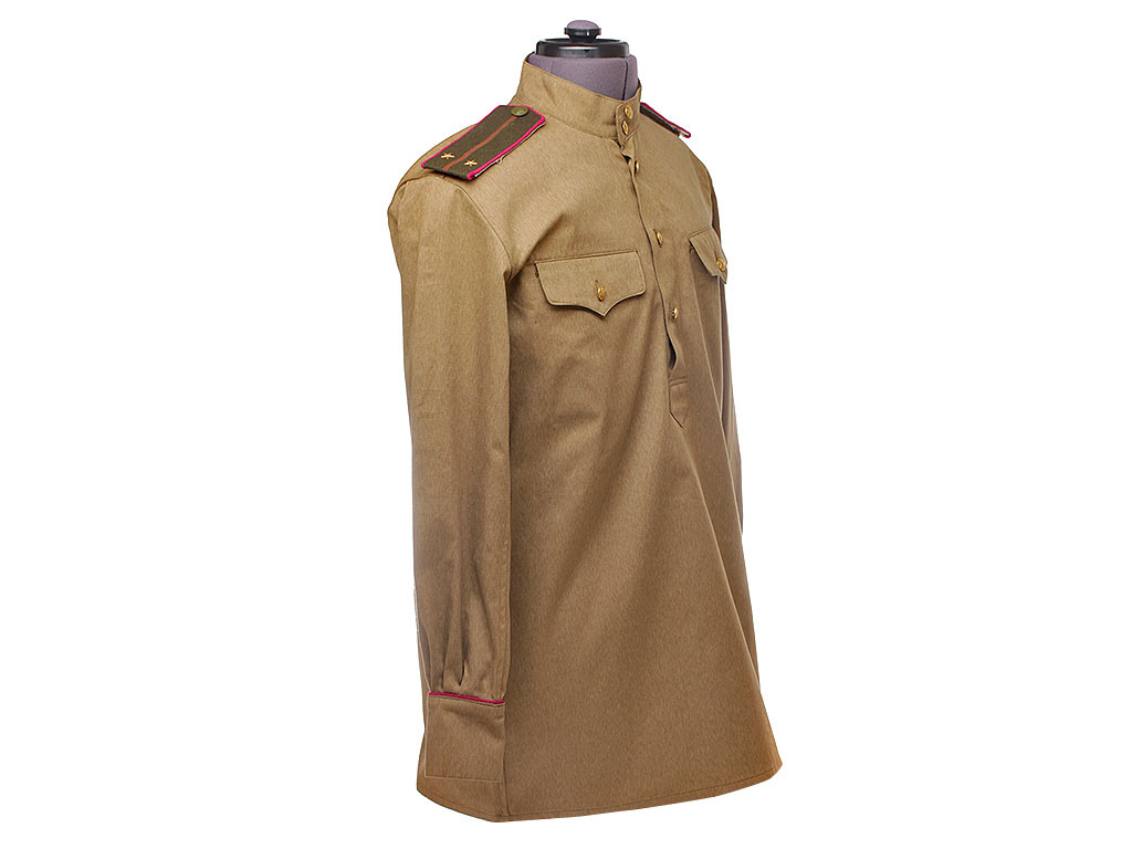 Гимнастерка (летняя рубаха) введена Приказом Народного Комиссара Обороны СССР № 25 от 15 января 1943 года. Изготовлена из хлопчатобумажной ткани защитного цвета со стоячим мягким воротником, застегивающимся на две форменные пуговицы малого размера через сквозные петли. На плечах пристегнуты погоны установленного образца. Рубаха имеет нагрудную планку с застежкой на три пуговицы и два нагрудных прорезных (встроенных) кармана с клапанами на одной пуговице (т.к. это гимнастерка начсостава - у рядового состава карманы на 1943 год отсутствуют). Рукава имеют обшлага с двумя пуговицами. Обшлага имеют цветной кант (в данном случае - малинового цвета). Такой же кант имеют и галифе.