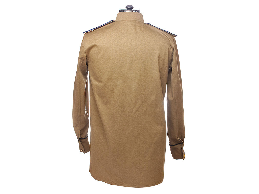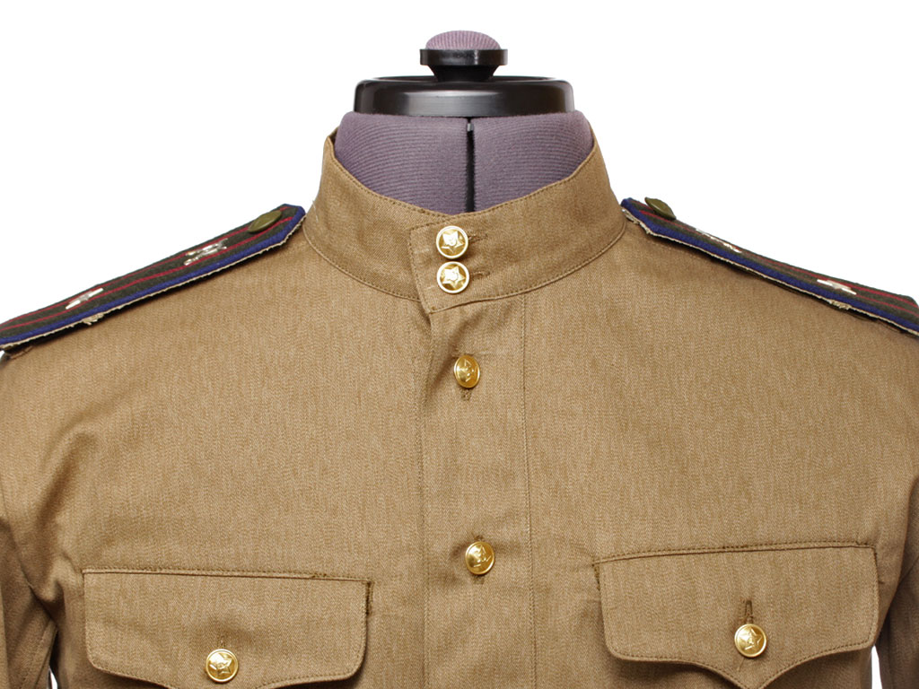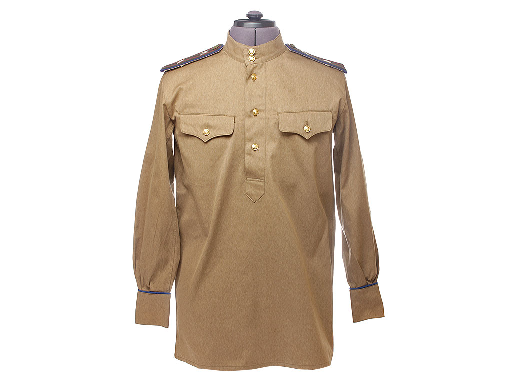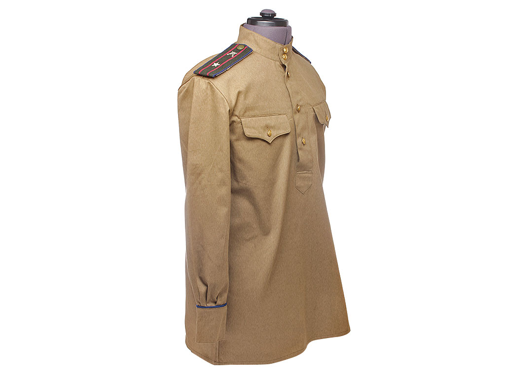 Гимнастерка (летняя рубаха) введена Приказом Народного Комиссара Обороны СССР № 25 от 15 января 1943 года. Изготовлена из хлопчатобумажной ткани защитного цвета со стоячим мягким воротником, застегивающимся на две форменные пуговицы малого размера через сквозные петли. На плечах пристегнуты погоны установленного образца. Рубаха имеет нагрудную планку с застежкой на три пуговицы и два нагрудных прорезных (встроенных) кармана с клапанами на одной пуговице (т.к. это гимнастерка начсостава - у рядового состава карманы на 1943 год отсутствуют). Рукава имеют обшлага с двумя пуговицами. Обшлага имеют цветной кант (в данном случае - светло-синего цвета). Такой же кант имеют и галифе.
