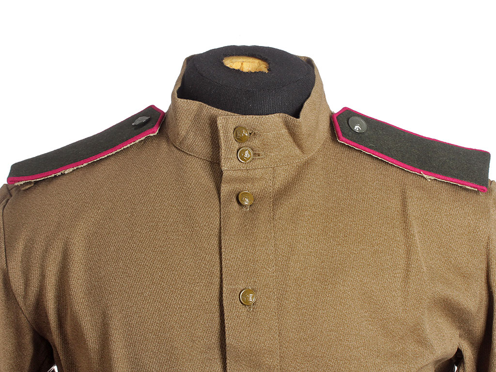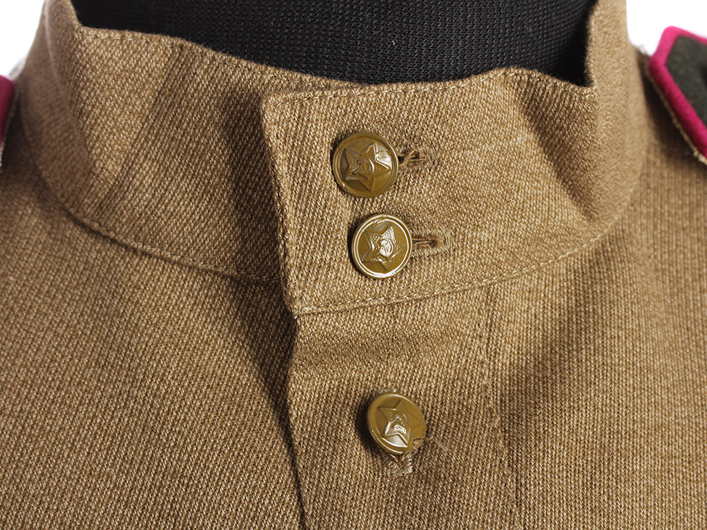 Воротники гимнастерок всех образцов взамен отложных - стоячие, мягкие застегивающиеся сквозными петлями спереди на две форменные пуговицы малого размера.