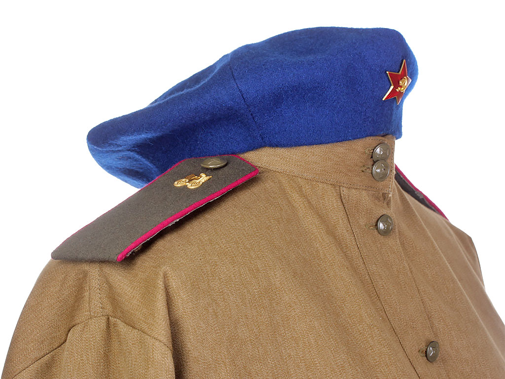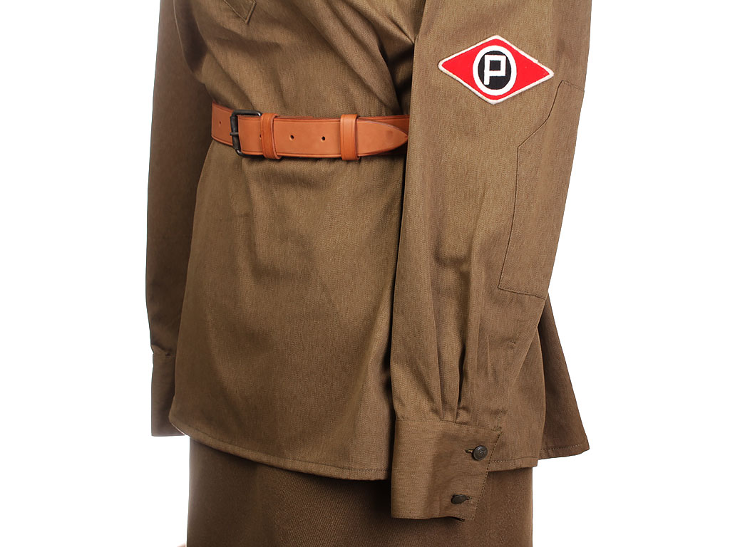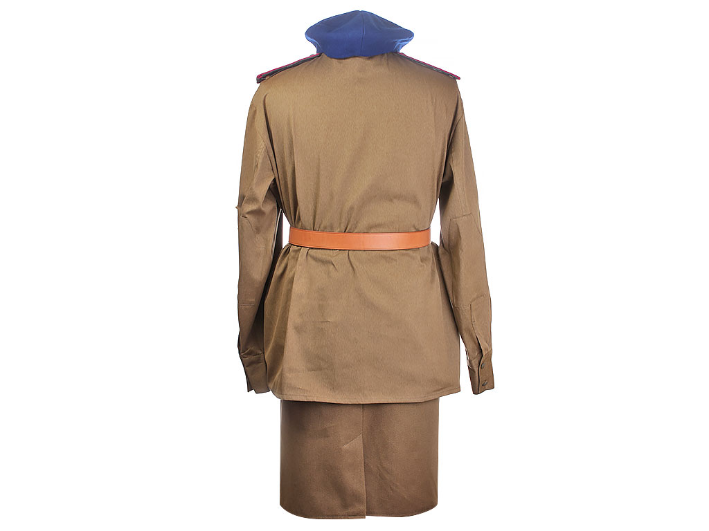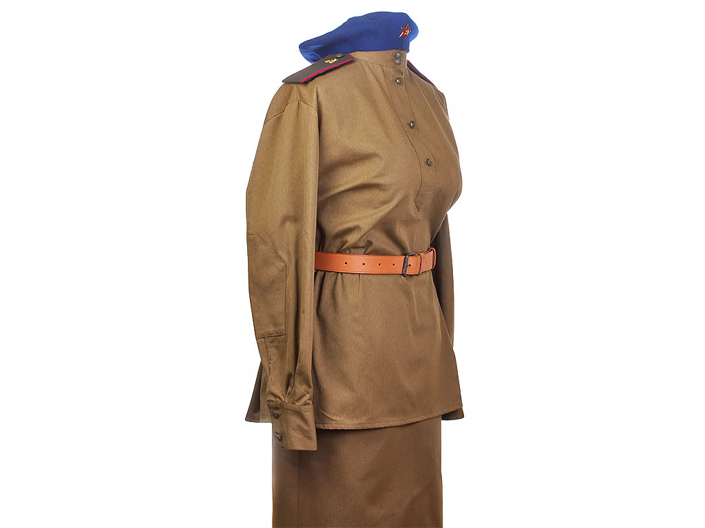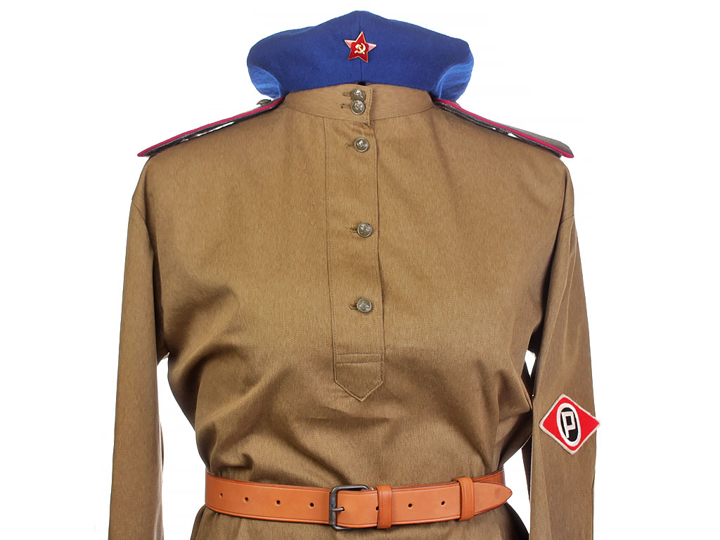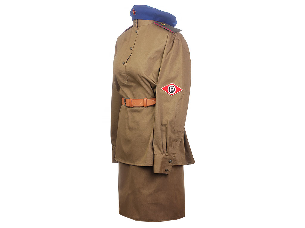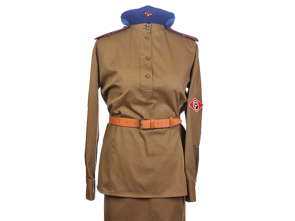 Комплект хлопчатобумажной формы регулировщицы РККА. Включает в себя гимнастерку образца 1943 года с воротником-стоечкой, погоны с эмблемой автомобильных частей, хлопчатобумажную юбку и темно-синий суконный берет с кокардой-звездочкой. На левом рукаве - горизонтально расположенная ромбовидная нашивка с буквой "Р". В комплект также входит кожаный ремень с одношпеньковой рамочной пряжкой.