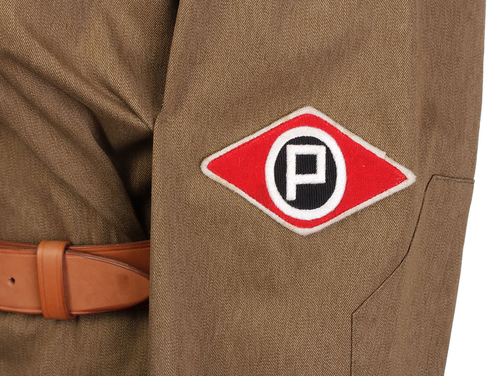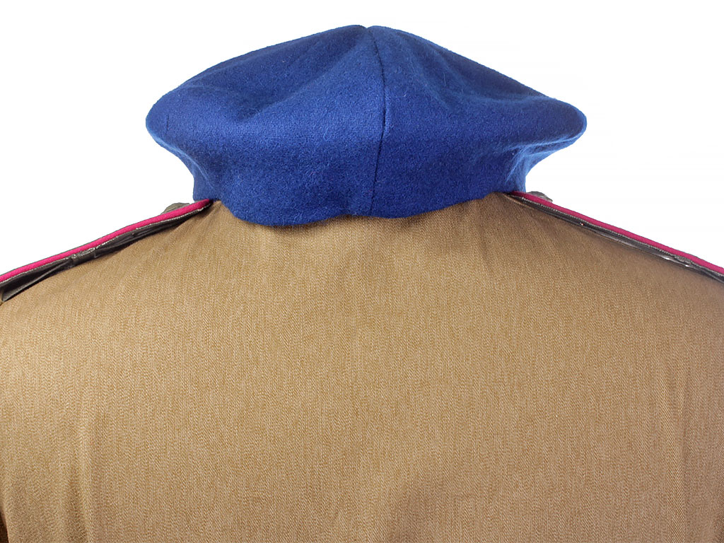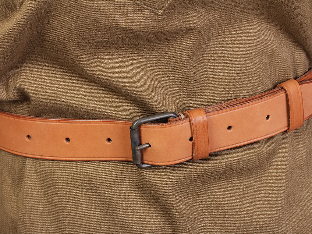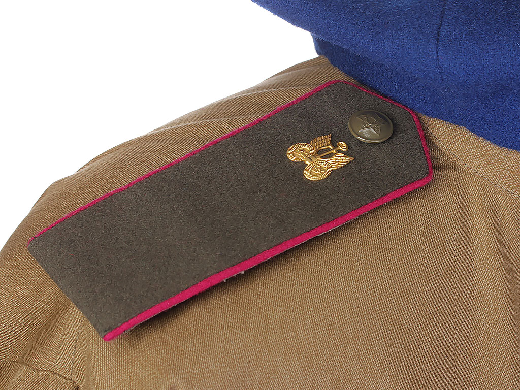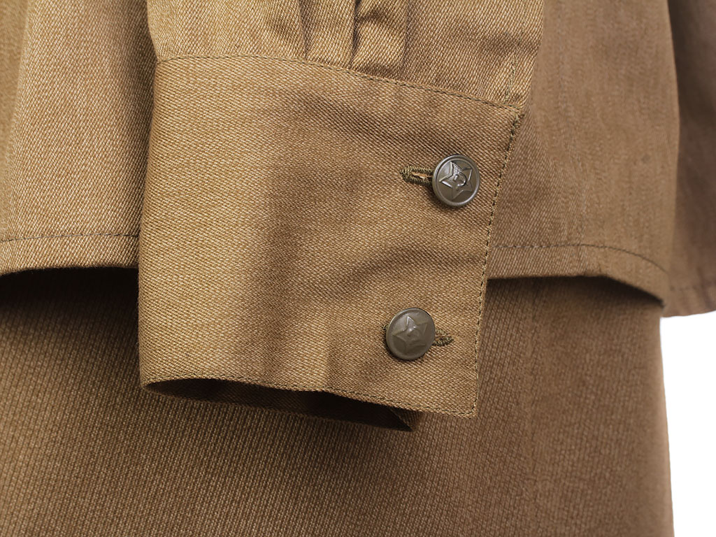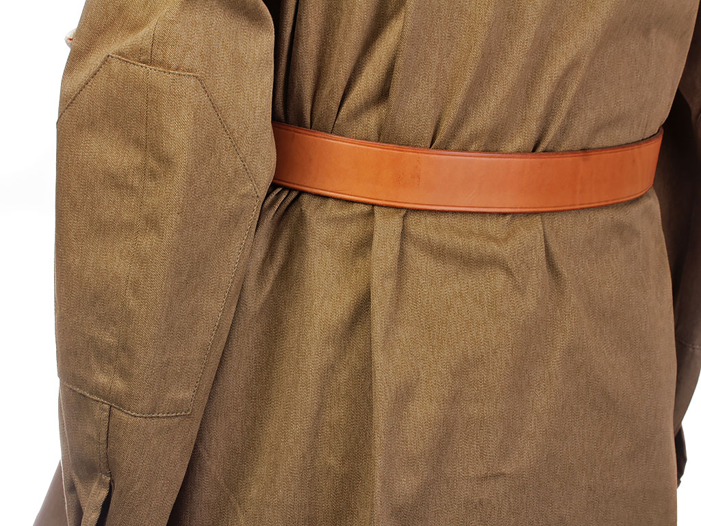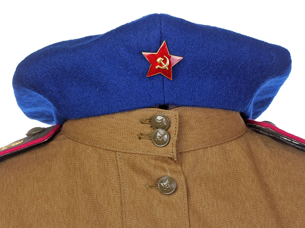 Комплект хлопчатобумажной формы регулировщицы РККА. Включает в себя гимнастерку образца 1943 года с воротником-стоечкой, погоны с эмблемой автомобильных частей, хлопчатобумажную юбку и темно-синий суконный берет с кокардой-звездочкой. На левом рукаве - горизонтально расположенная ромбовидная нашивка с буквой "Р". В комплект также входит кожаный ремень с одношпеньковой рамочной пряжкой.