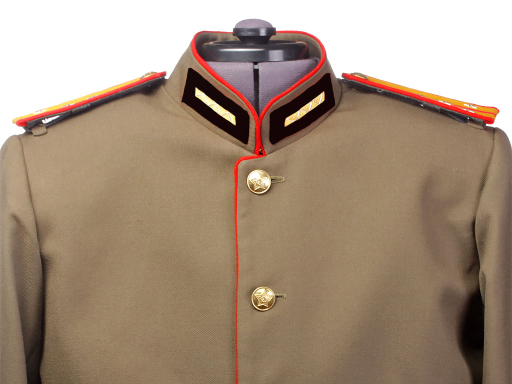 Копия парадного мундира со знаками различия капитана артиллерии или автобронетанковых войск РККА образца 1943 года. Именно такие мундиры использовались на Параде Победы 24 июня 1945 года. От повседневного мундира такой мундир отличается наличием петлиц на воротнике и катушек на рукавах.