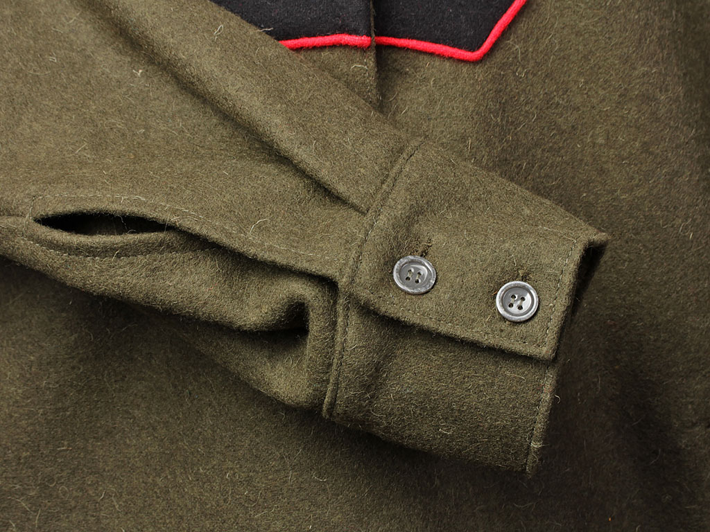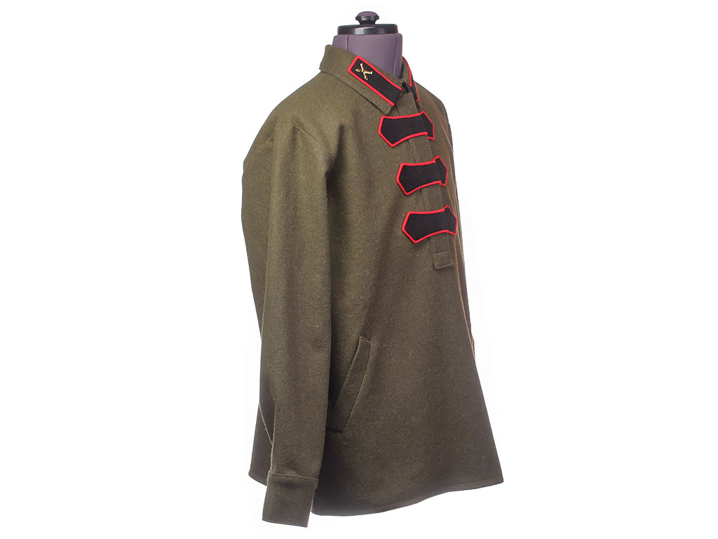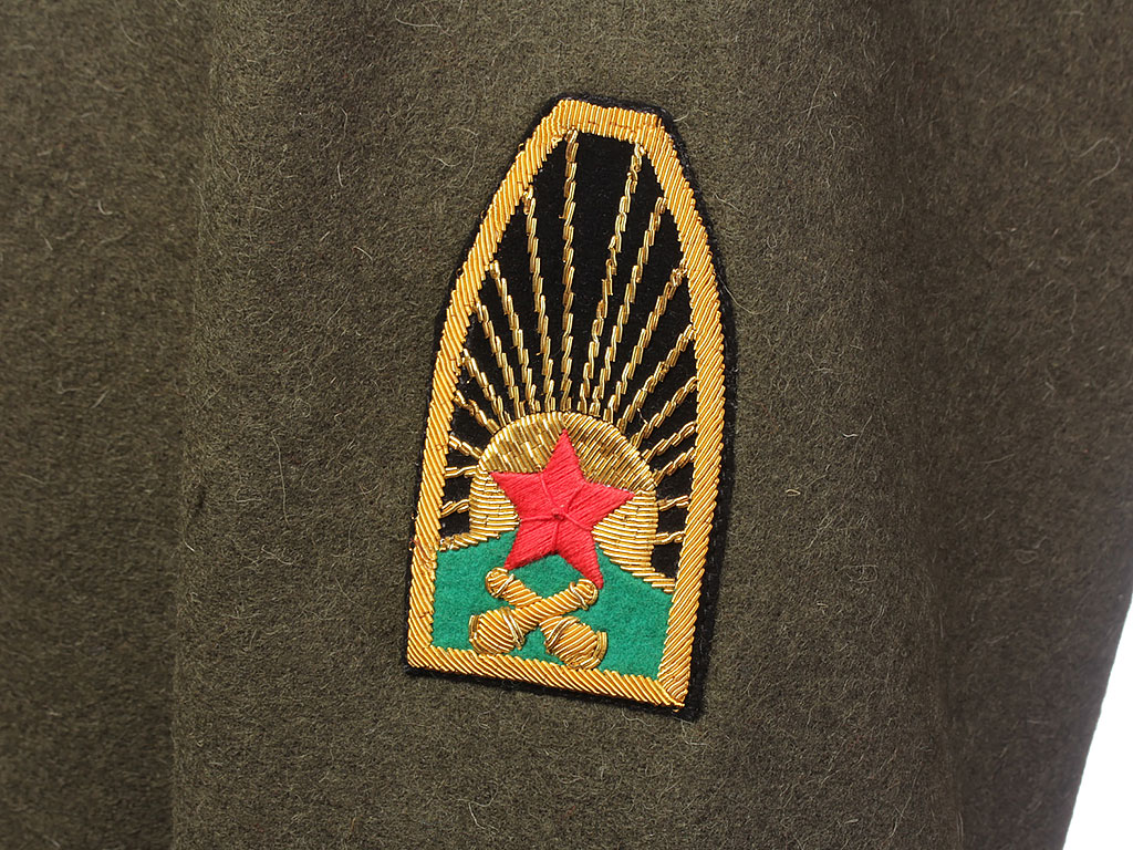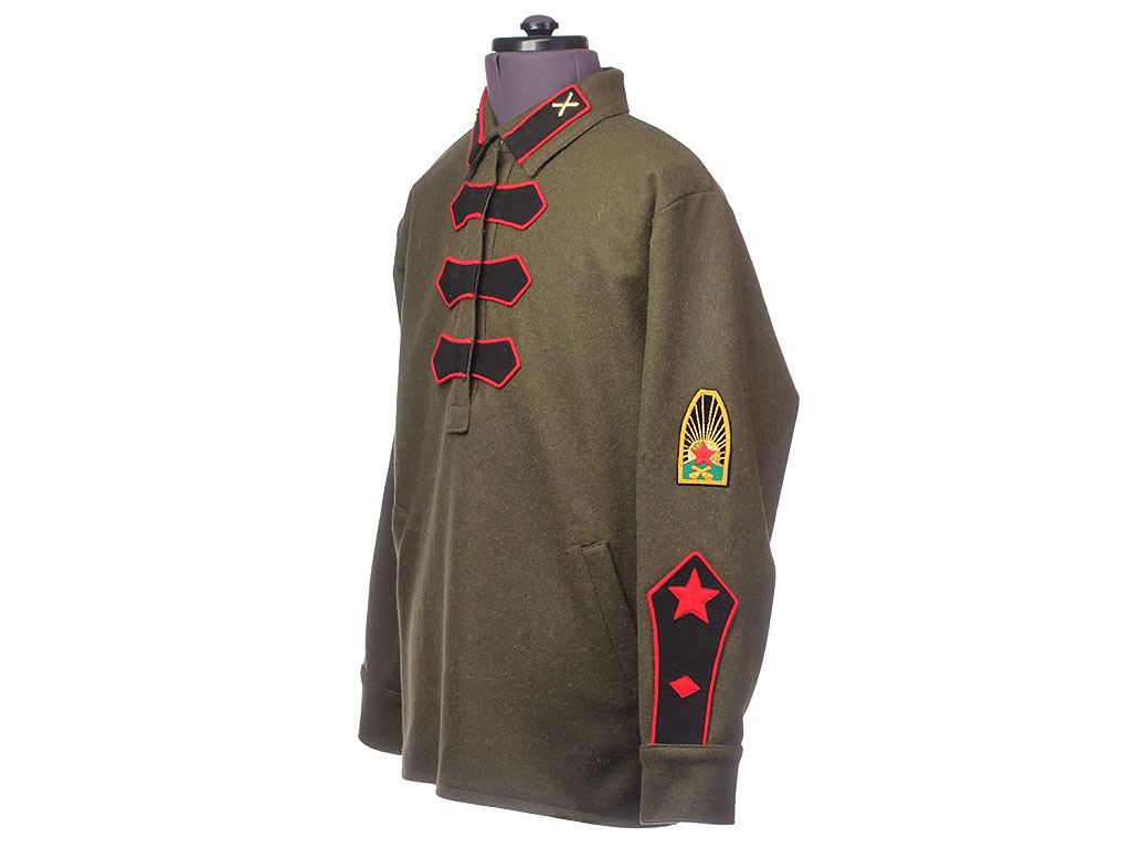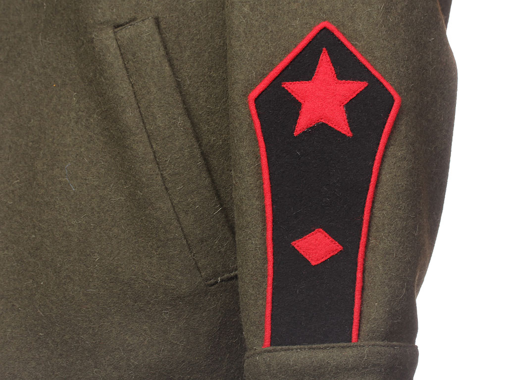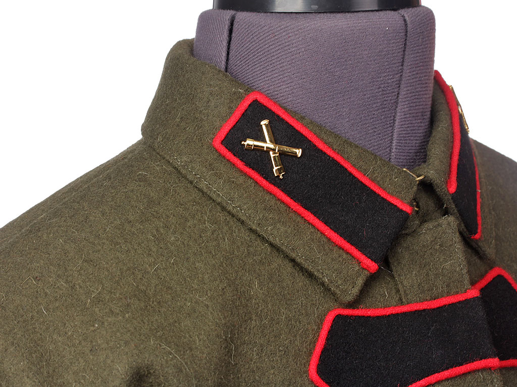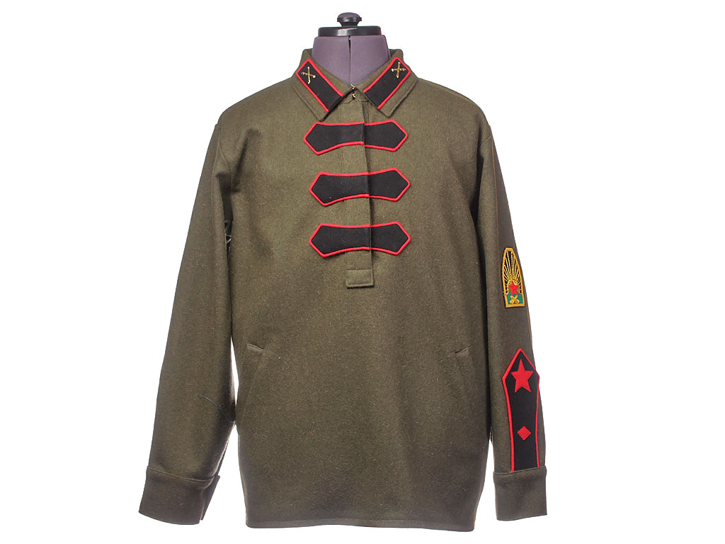 Гимнастерка со знаками различия командира артиллерийской бригады. Петлицы и "разговоры" имеют черное поле с красным кантом, они были введены в 1924 году, заменив введенные в 1923 году красные петлицы и "разговоры" с красным кантом. На рукаве нашивка командира артиллерии РККА, вышитая вручную разными видами золотой канители, нарукавный клапан со звездой и ромбом комбрига, на воротнике (петлицах) - позолоченные скрещенные пушки.