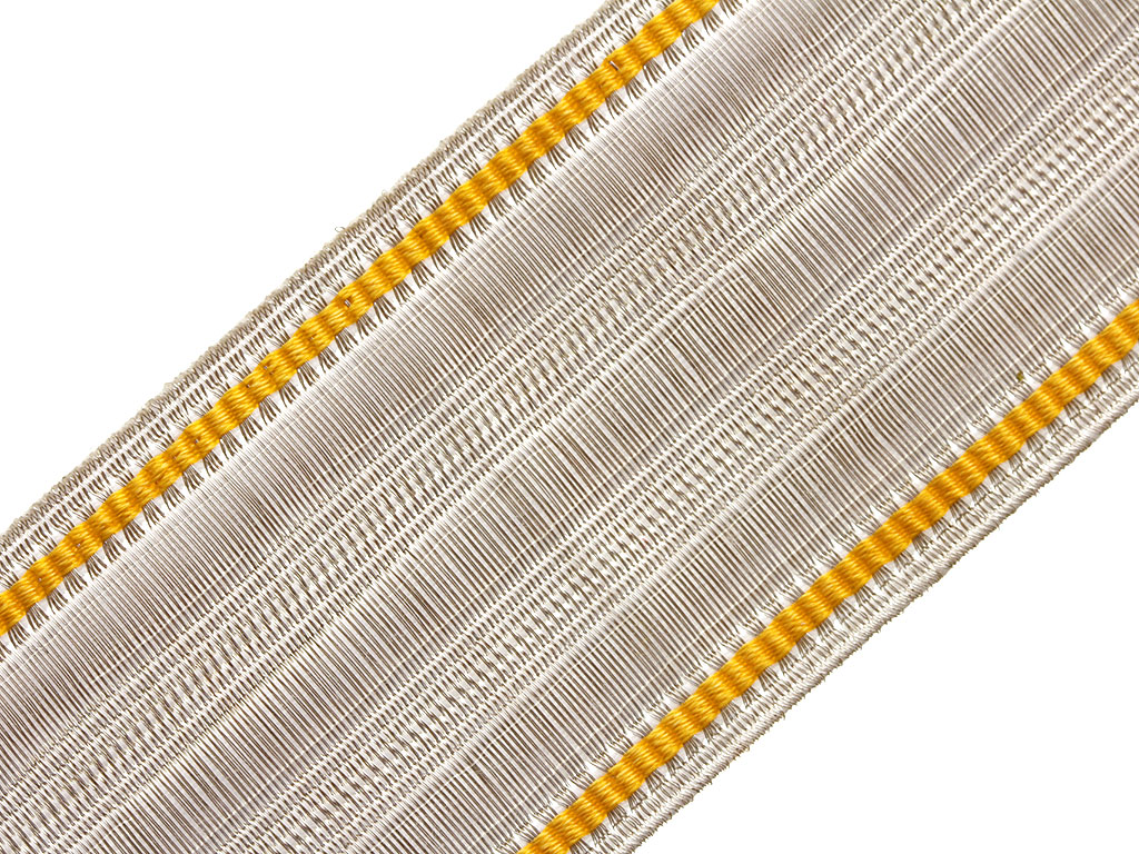 Серебряный галун с тонким желтым просветом, ширина галуна 35 мм.