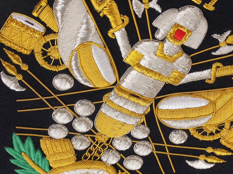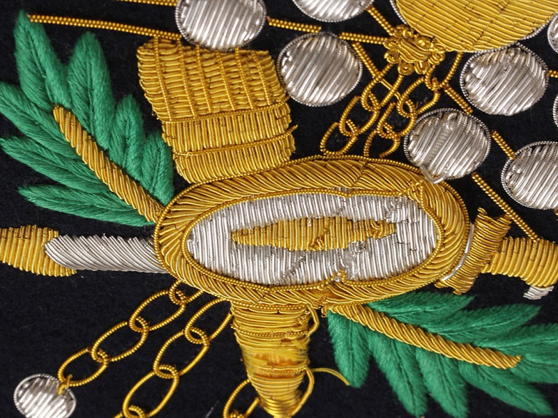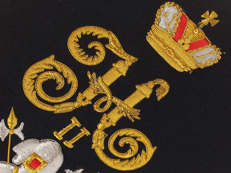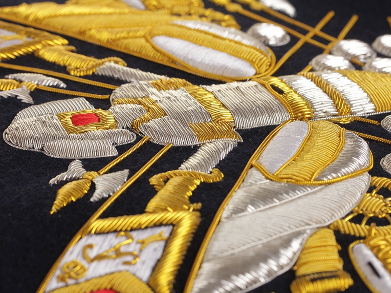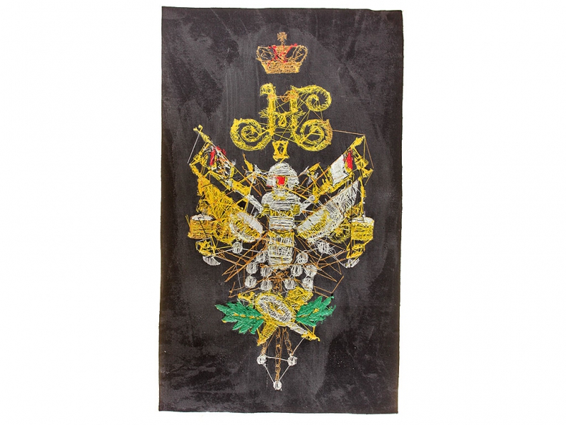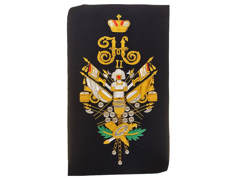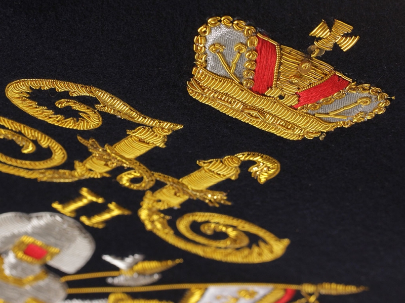 Вензель Императора Николая II в "триумфальной" арматуре при изготовлении реплики выполнен различными видами канители и шелка.