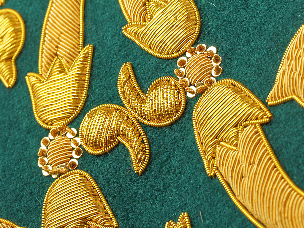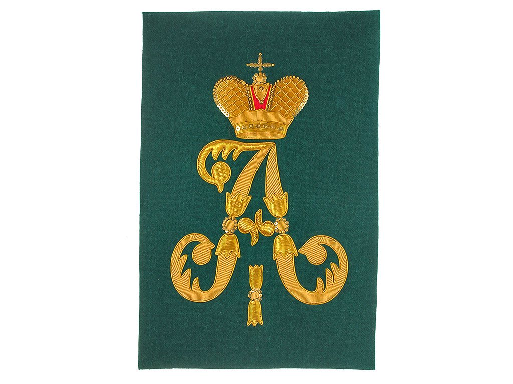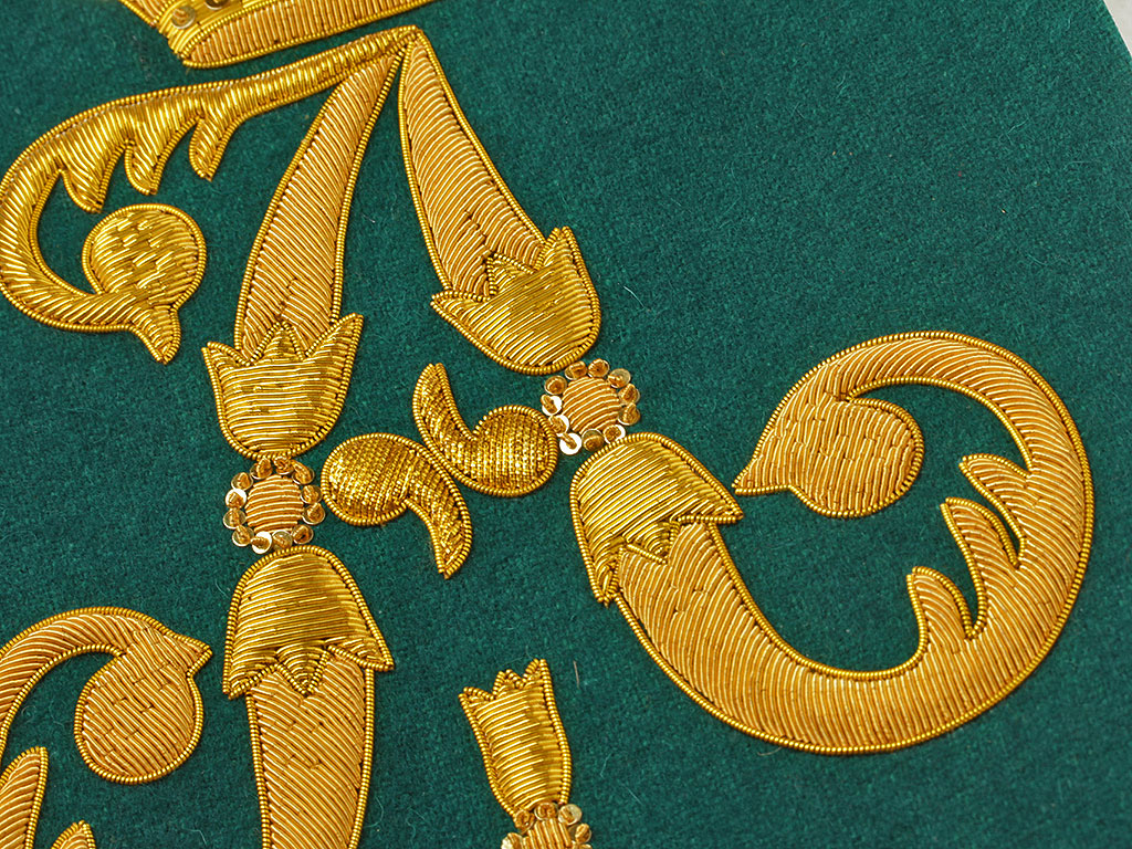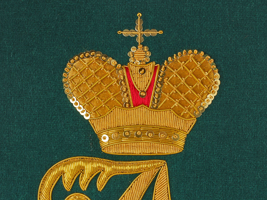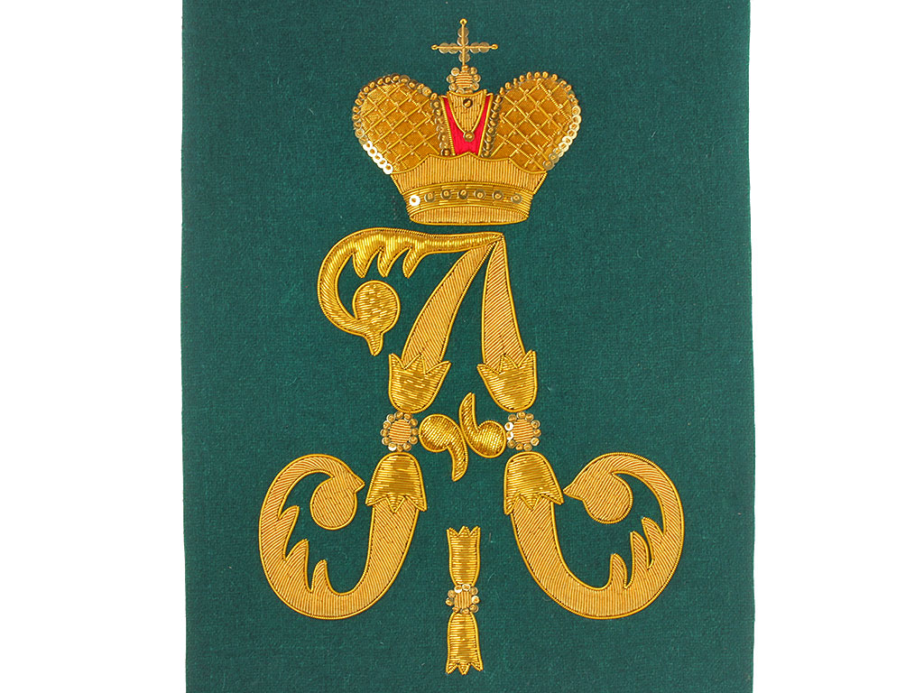 Очень красивая объемная вышивка при изготовлении реплики выполнена различными видами канители. Размер шитого вензеля - 25 см.