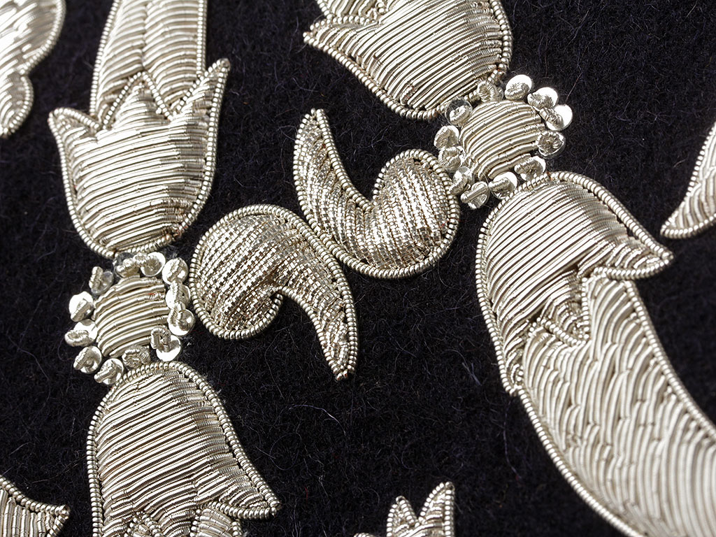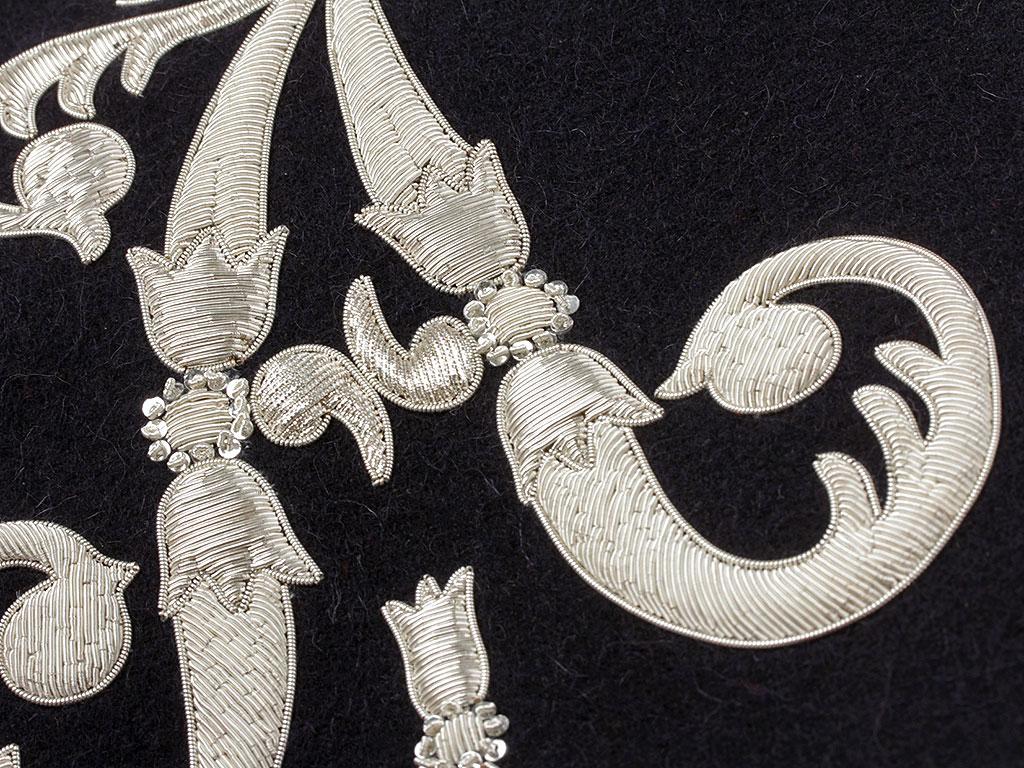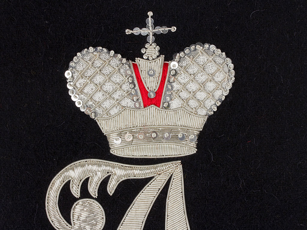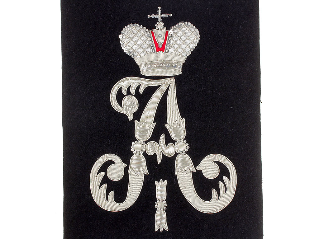 Очень красивая объемная вышивка при изготовлении реплики выполнена различными видами канители. Размер шитого вензеля - 25 см.