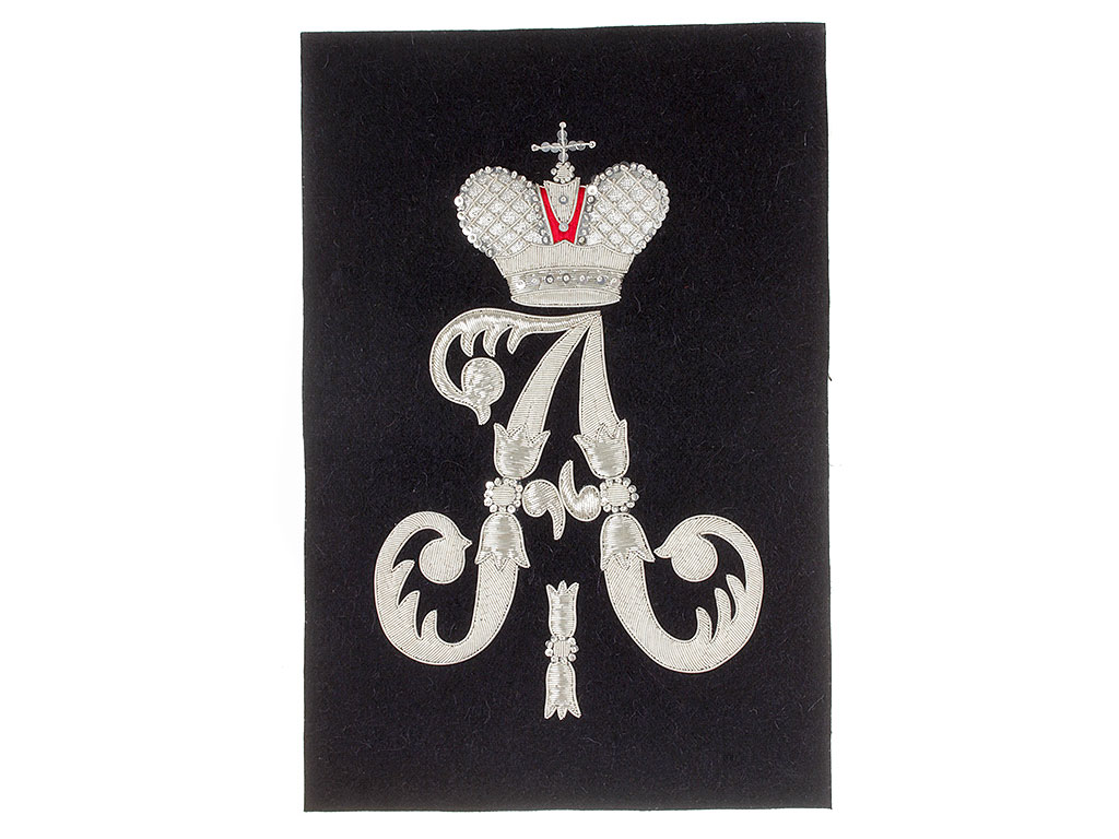Шитый серебряной металлизированной канителью вензель "А 1" Императора Александра Первого на офицерский вальтрап (чепрак) Александрийского гусарского полка ("Бессмертных Гусар"). Данному полку соответствовал присвоенный им чепрак черного цвета с серебряным шитьем, сам вальтрап был обшит по краю широким зигзагообразным серебряным галуном.