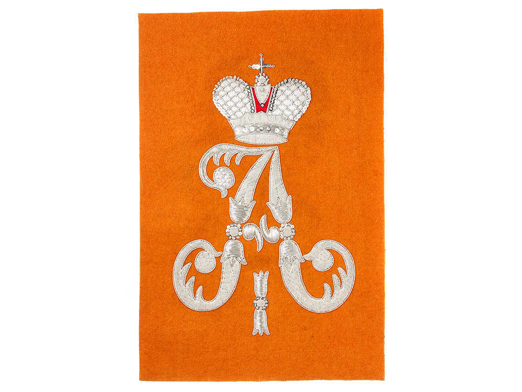 Шитый серебряной металлизированной канителью вензель "А 1" Императора Александра Первого на офицерский вальтрап (чепрак) Екатеринославского кирасирского полка. Данному полку соответствовал присвоенный им чепрак оранжевого цвета с серебряным шитьем, сам вальтрап был обшит по краю широким прямым серебряным галуном.