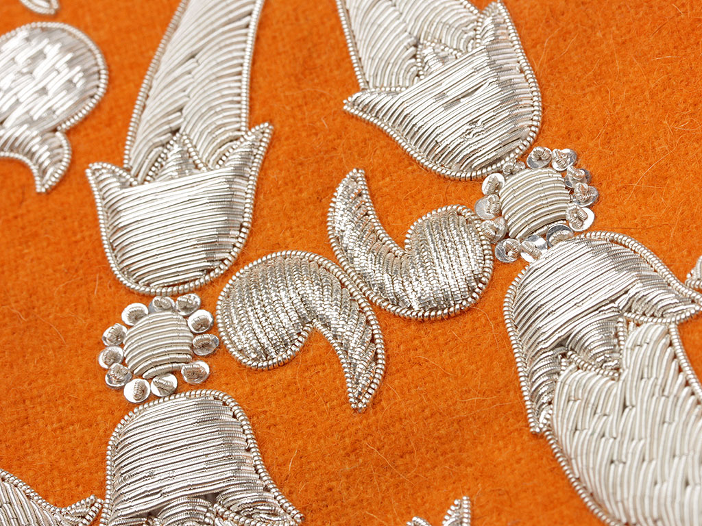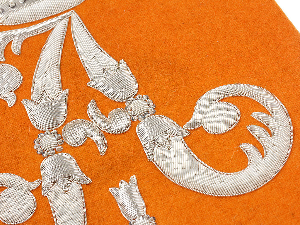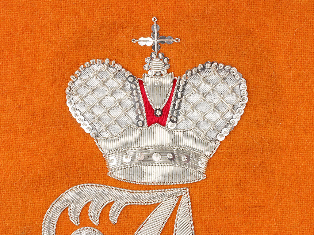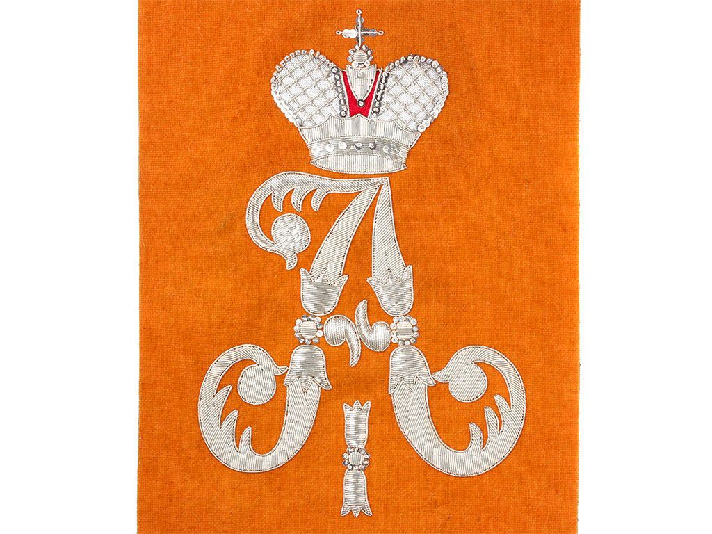 Очень красивая объемная вышивка при изготовлении реплики выполнена различными видами канители. Размер шитого вензеля - 25 см.