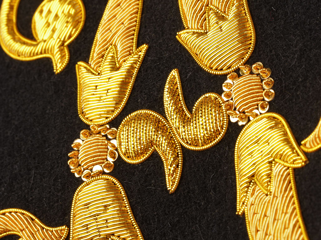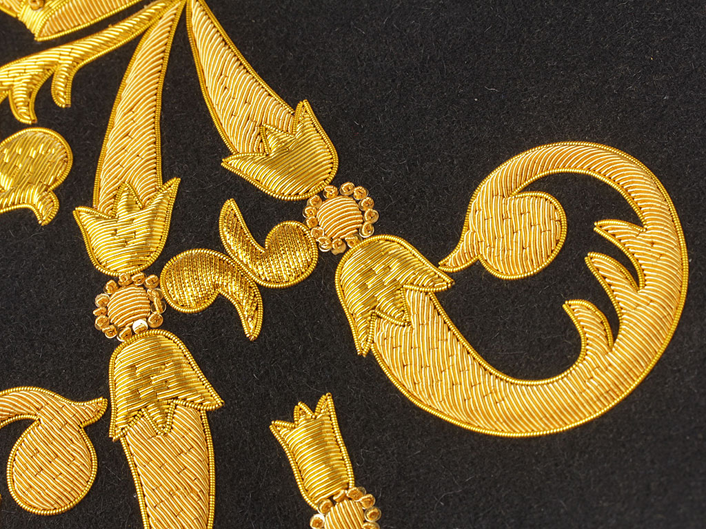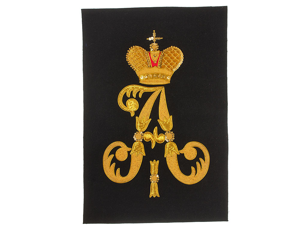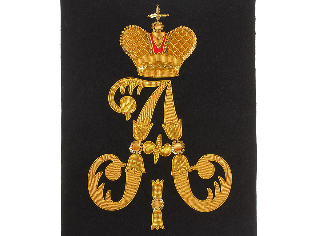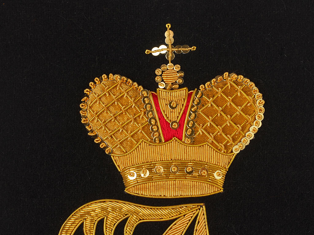 Очень красивая объемная вышивка при изготовлении реплики выполнена различными видами канители. Размер шитого вензеля - 25 см.