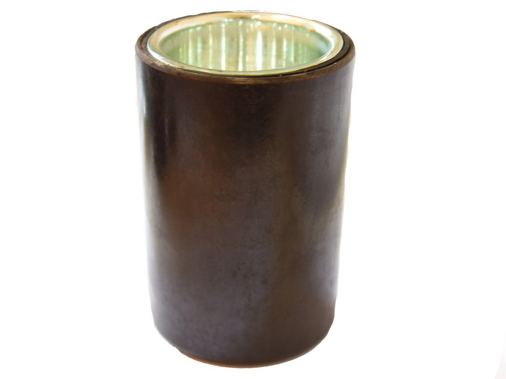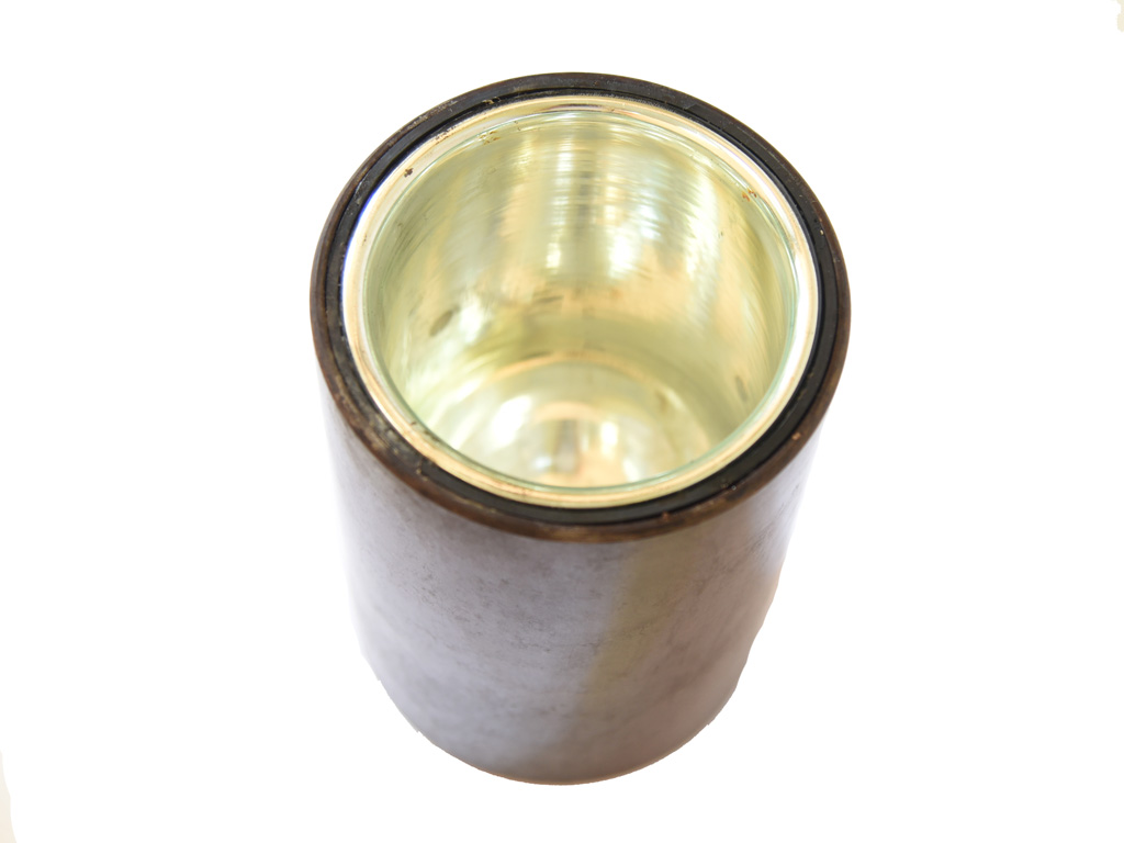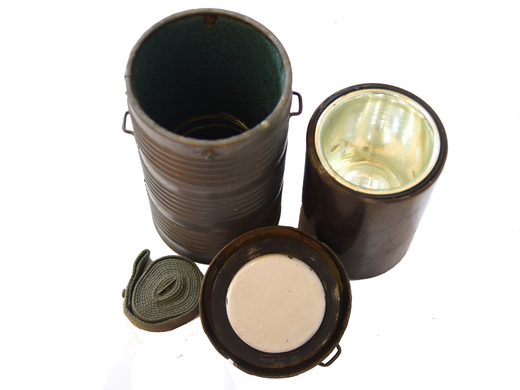 Полевой термос в цилиндрической формы металлическом рифленом корпусе, со съемной металлической крышкой и ремнем для переноски. Внутри - бакелитовая вставка со стеклянной колбой, полезная емкость около 1 литра. Отличное состояние.