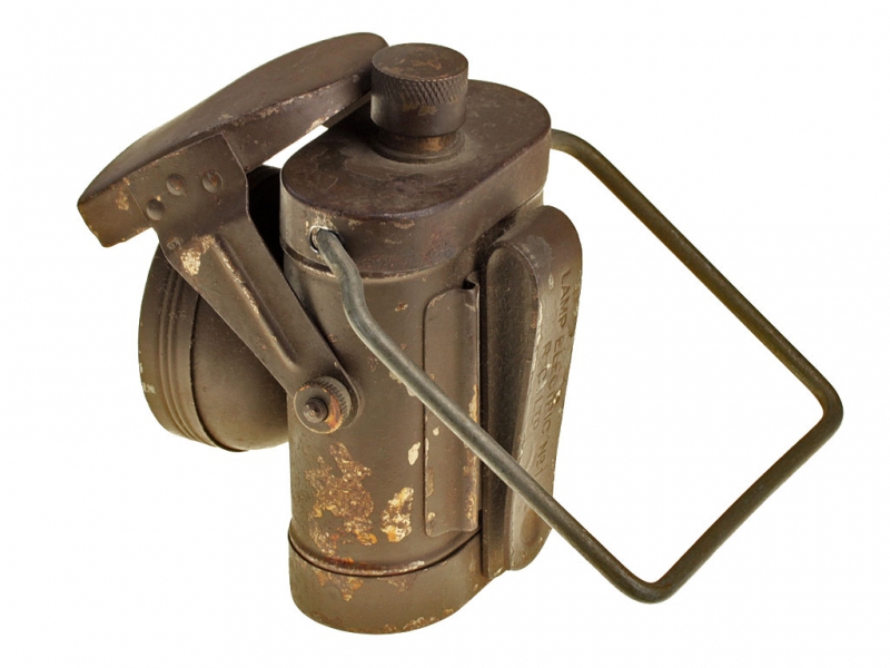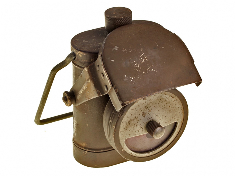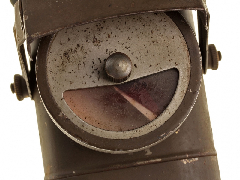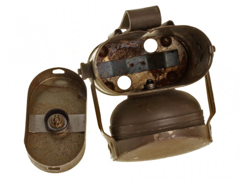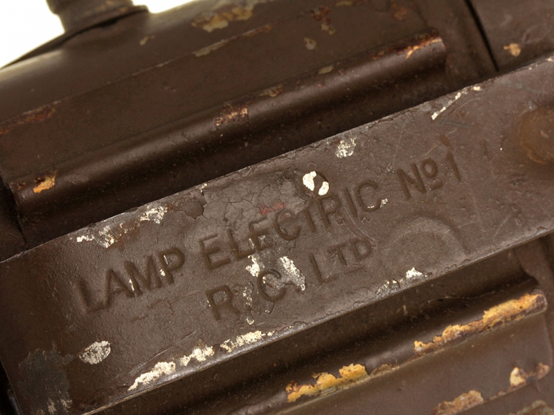 Армейский солдатский электрический фонарик периода Первой мировой войны. В прочном металлическом корпусе, с ручкой для переноски и широкой клипсой для крепления к поясу или униформе. Лампочка закреплена в отдельном круглом элементе корпуса со штырьком, вращая который, можно закрыть ее красным светофильтром. Для подачи прерывистого сигнала предусмотрено откидное металлическое "забрало", которое также защищает стекло от повреждений. На клипсе имеются клейма: "LAMP ELECTRIC №1 R.C.Ltd".