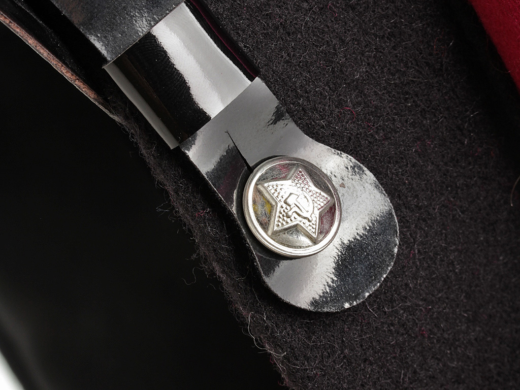 На околыше фуражки, над черным фибровым козырьком на двух малых форменных пуговицах генералы носили золотой филигранный шнур, а остальной личный состав — черный кожаный подбородный ремень.