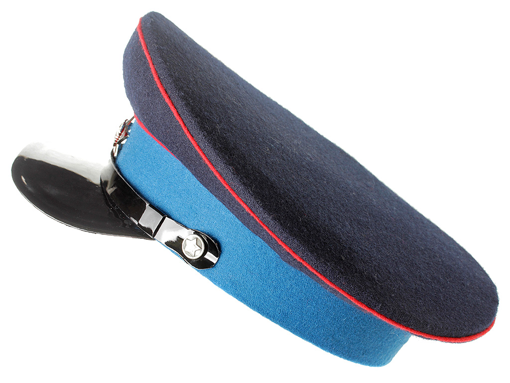 Фуражка изготавливалась из сукна темно-синего цвета для начсостава и из хлопчатобумажной ткани темно-синего цвета — для рядового и младшего начсостава. Околыш — бирюзового цвета, канты - красного цвета, козырек — черный лакированный; подбородный ремешок лакированный, черного цвета. Знак для головного убора — установленного образца.