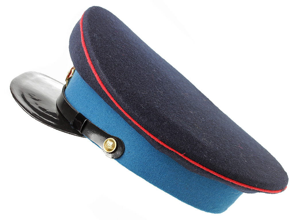 Фуражка изготавливалась из сукна темно-синего цвета для начсостава и из хлопчатобумажной ткани темно-синего цвета — для рядового и младшего начсостава. Околыш — бирюзового цвета, канты - красного цвета, козырек — черный лакированный; подбородный ремешок лакированный, черного цвета. Знак для головного убора — установленного образца.