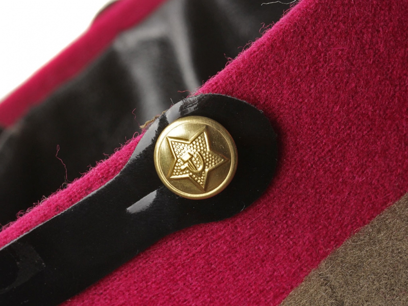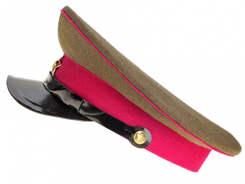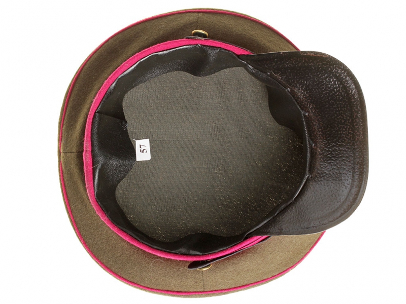 Копия очень хорошего качества. Малиновый околыш, тулья цвета хаки, кант малинового цвета.