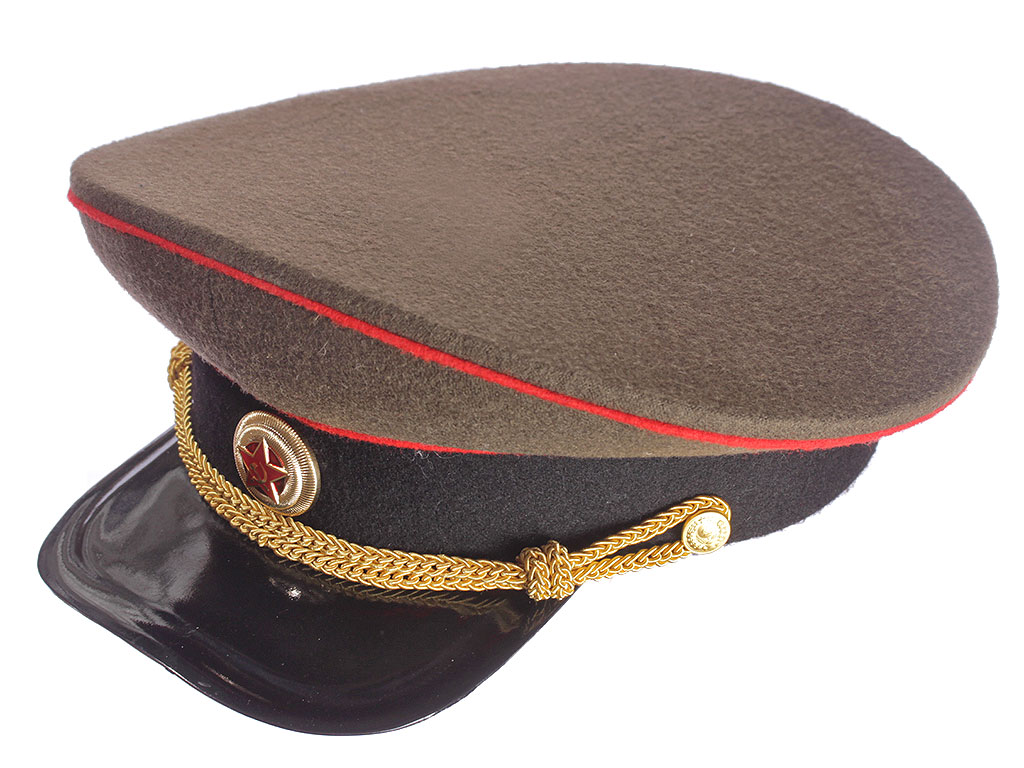 Черный суконый околыш, тулья цвета хаки, кант красного цвета.