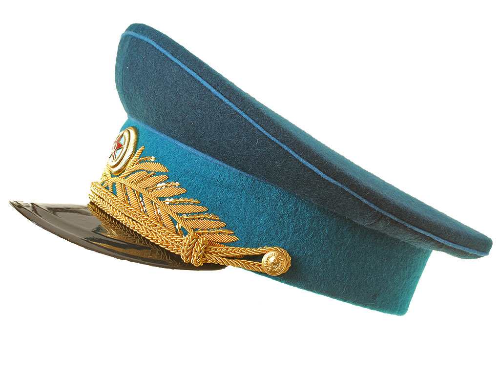 Парадная фуражка с шитьем установленного образца. Канты на тулье в цвет окантовки мундира, голубой околыш с шитьем золотистого цвета в виде лавровых ветвей на передней части и круглой генеральской кокардой в середине существующего образца. Филигран (подбородный шнурок) золотистого цвета на двух малых пуговицах. Козырек черного цвета лакированный.