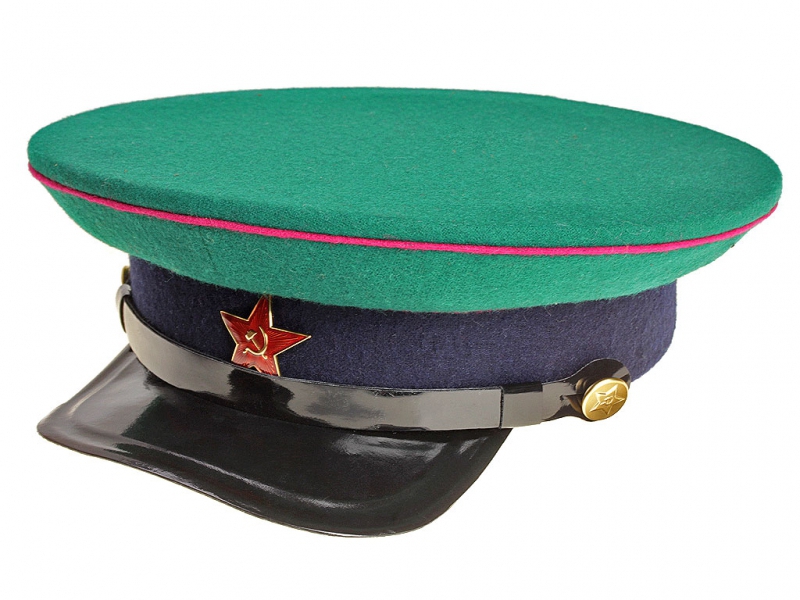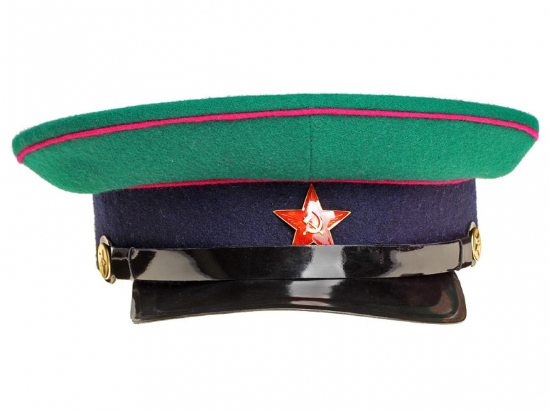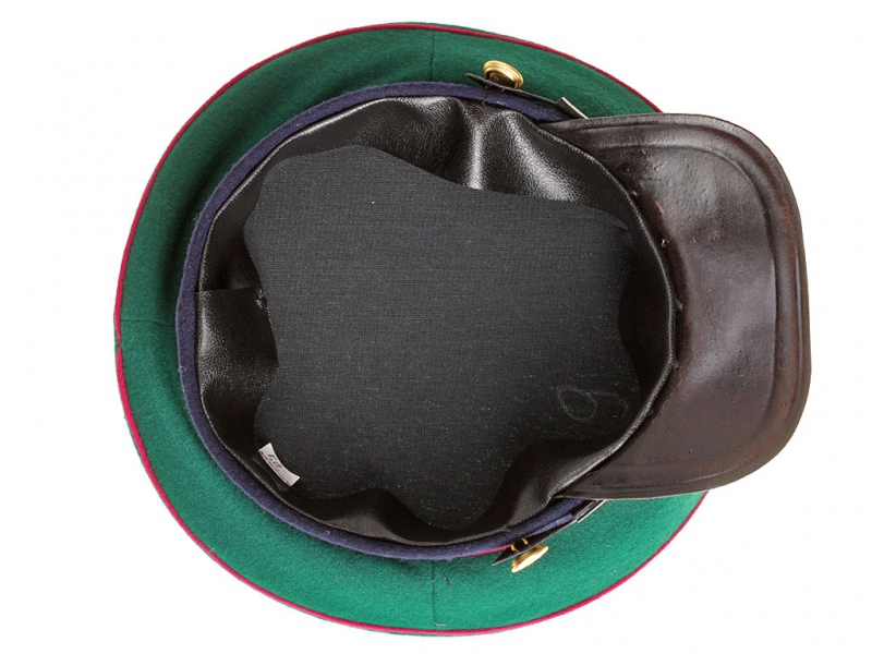 Суконная фуражка с зеленой тульей и темно-синим околышем. Подкладка фуражки - сатиновая. Подтулейник - из дерматина. Козырек фуражки фибровый, черный, лакированный, удлиненной формы. Над козырьком, к форменным латунным пуговицам, пристегнут черного цвета подбородный ремешок.