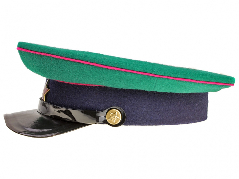 Темно-синий околыш, малиновый кант по тулье, зелёно-травянистая тулья.