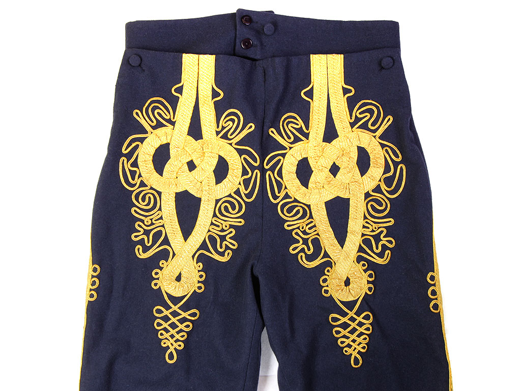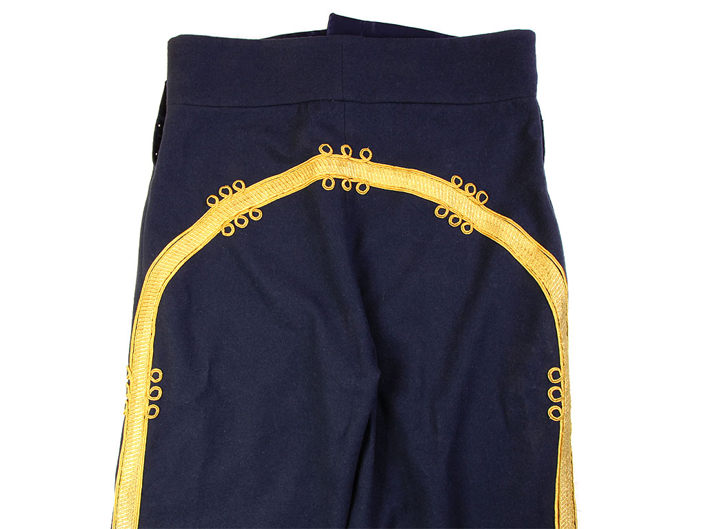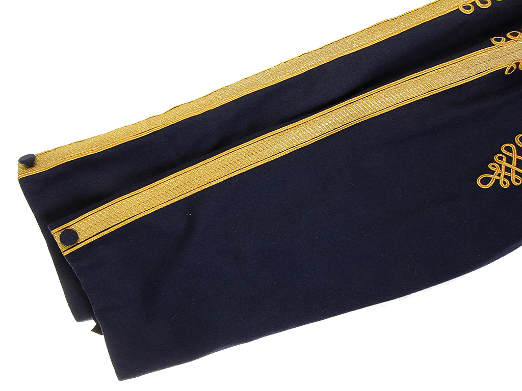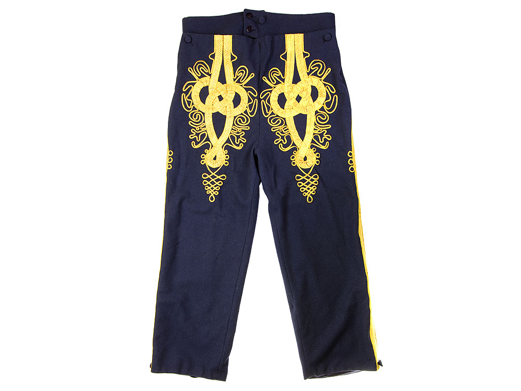 Синие, богато расшитые золотом чакчиры офицера - гусара Лейб-гвардии Гусарского Его Величества полка на 1812 год. Униформа этого покроя и расцветки существовала в Лейб-Гусарском полку (в то время он единственный из гусарских был гвардейским, остальные были армейскими) с 1809 по 1817 год (указом от 25 апреля 1809 года темно-синие чакчиры были введены в Лейб-гвардии Гусарском полку взамен белых). Именно такие чакчиры входили в комплект гусарской униформы в Отечественную войну 1812 года. Синее сукно, на лицевой стороне золотое шитье - плетение в виде "гусарского узла".