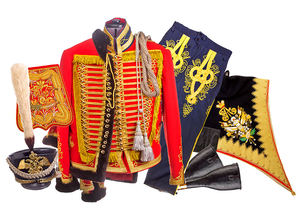 Гусарская униформа в 1812 году значительно отличалась от униформ других родов кавалерии свои видом. Ее столь значительное отличие объясняется происхождением этого рода легкой кавалерии. Гусары появились в Русской Армии в середине XVIII века. В то время гусарами были выходцы из Сербии, Венгрии. Они -то и принесли с собой присущий им вид военной одежды. Необычность и нарядность гусарской униформы понравилась и она прижилась в России. В течение века эта униформа несколько видоизменилась, сохранив однако свои характерные черты. Она состояла из следующих предметов: доломан, ментик, чакчиры, ботики, кивер, ташка, гусарский кушак. К ней же можно отнести один из элементов конского убора - вальтрап. Каждый полк имел свои расцветки гусарской униформы.