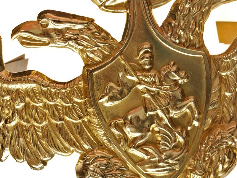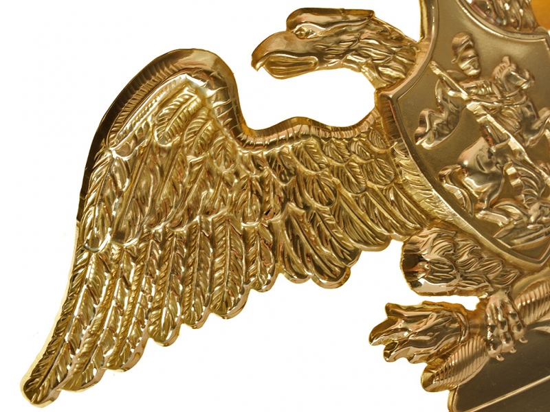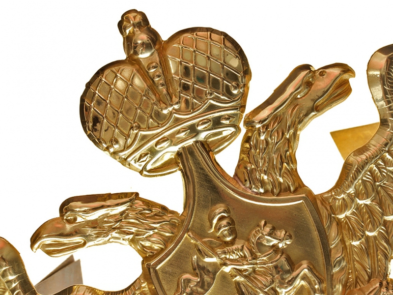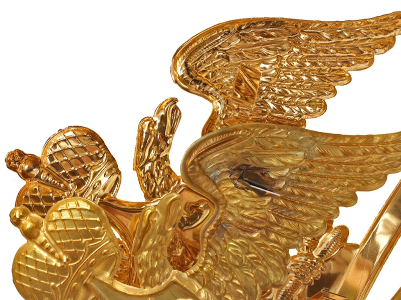 Представленный орел почти полностью повторяет Государственный герб Российской империи, установленный при Императоре Александре I. Он украшал не только элементы военной униформы, но и государственные учреждения, ценные бумаги, монеты. Его еще называют "орлом с опущенными крыльями" и "масонским" орлом.