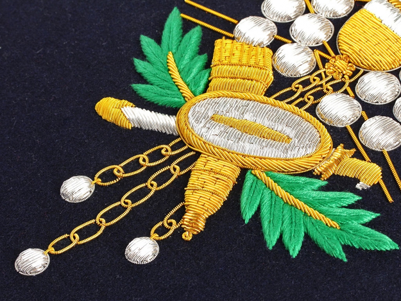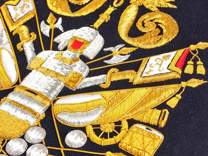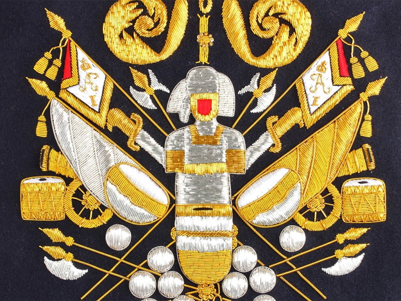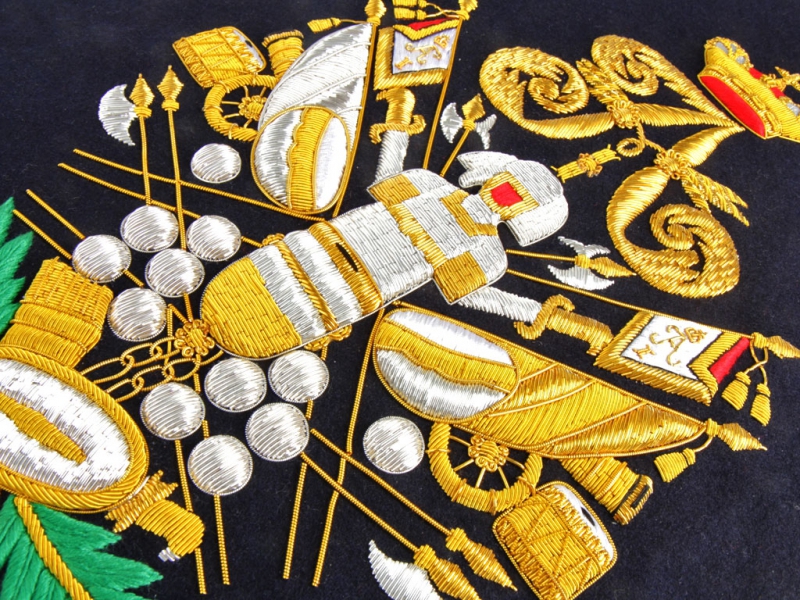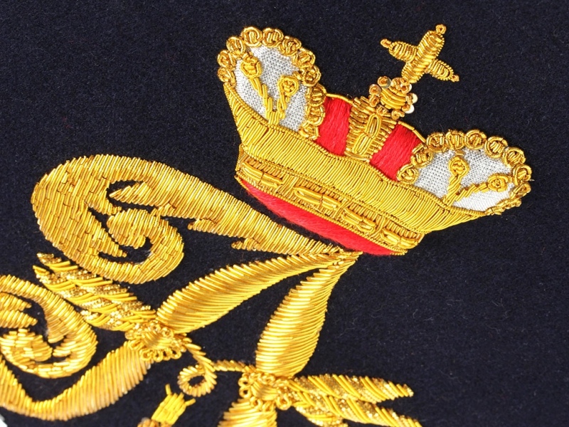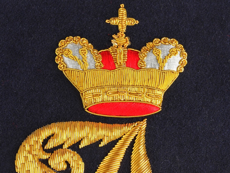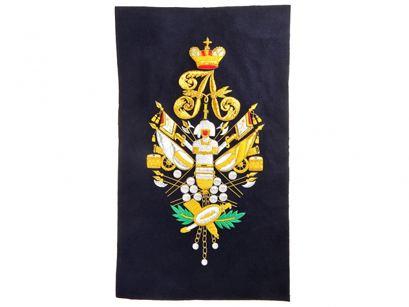 Вензель Императора Александра в "триумфальной" арматуре при изготовлении реплики выполнен различными видами канители и шелка.