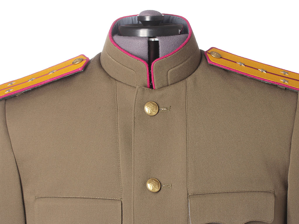 Китель офицерский повседневный образца 1943 года. Из качественной полушерстяной ткани, практически идентичной оригинальной. Воротник-стоечка имеет малиновую выпушку и застегивается на два крючка. Китель однобортный, с одним рядом металлических пуговиц. Имеет два нагрудных потайных кармана с клапанами. Рукава также имеют малиновую выпушку (пехотные части РККА). Китель укомплектован повседневными погонами со знаками различия капитана.
