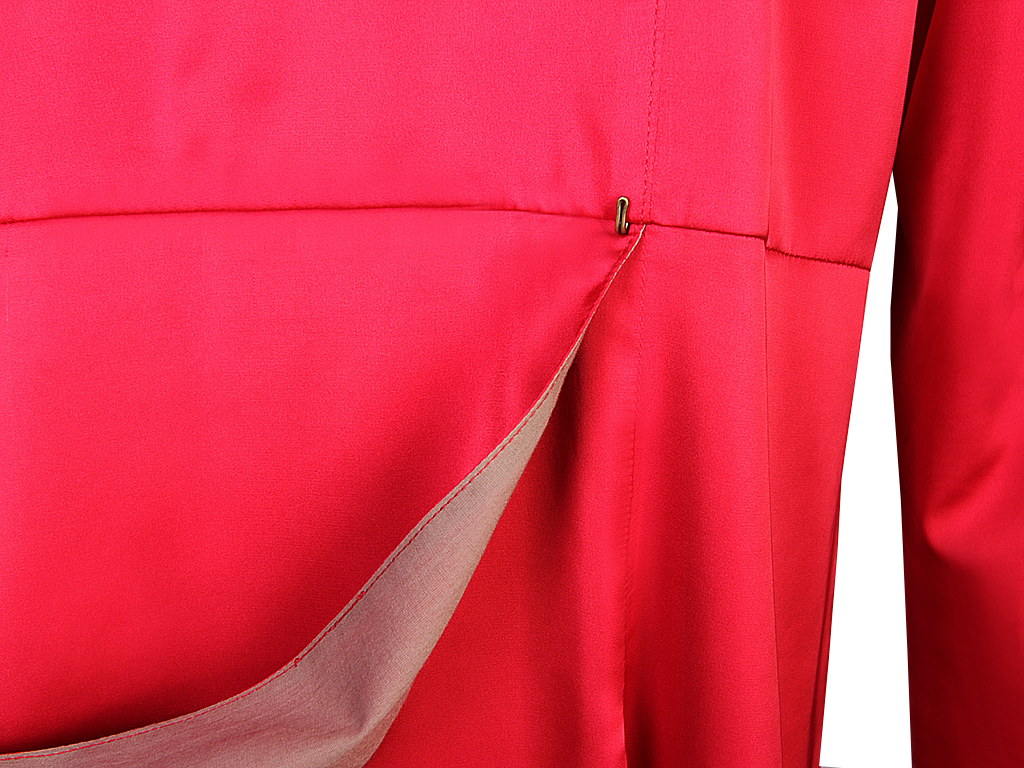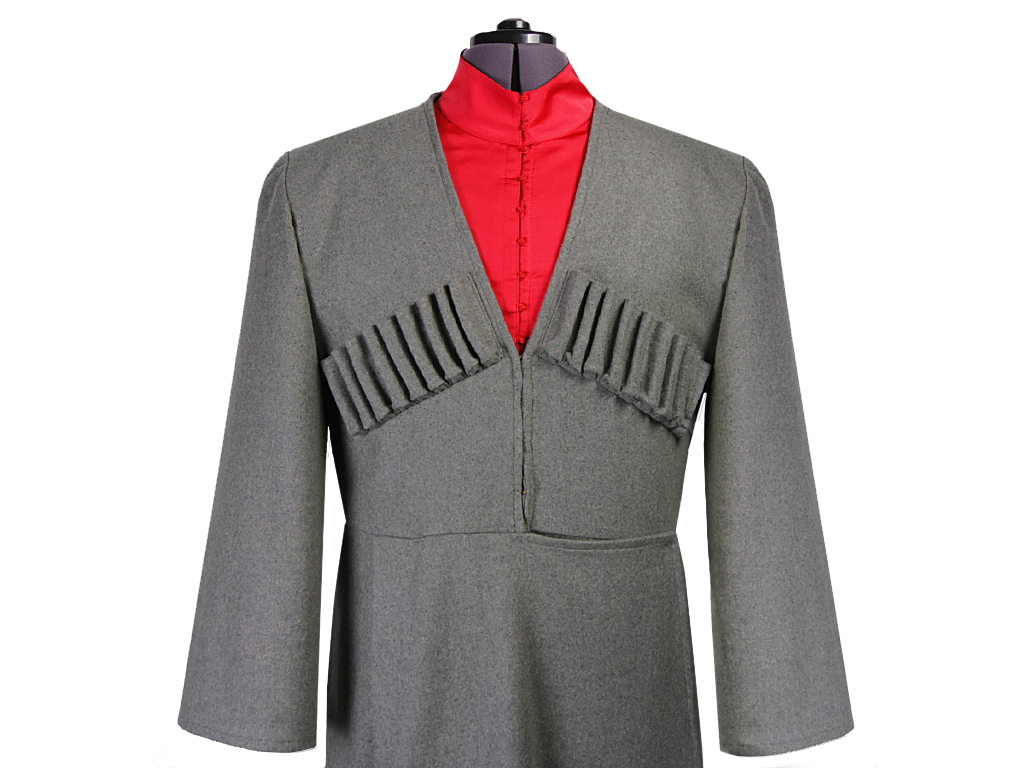 Традиционный однобортный покрой со стоячим воротником, бешмет застегивается на ряд матерчатых пуговок.