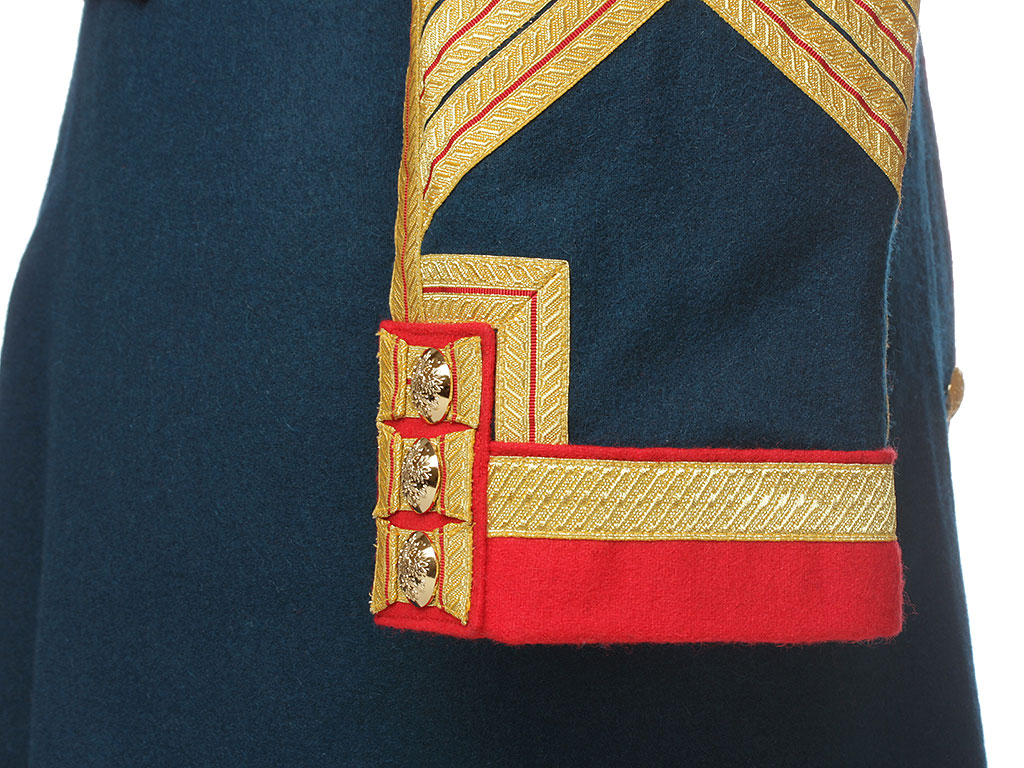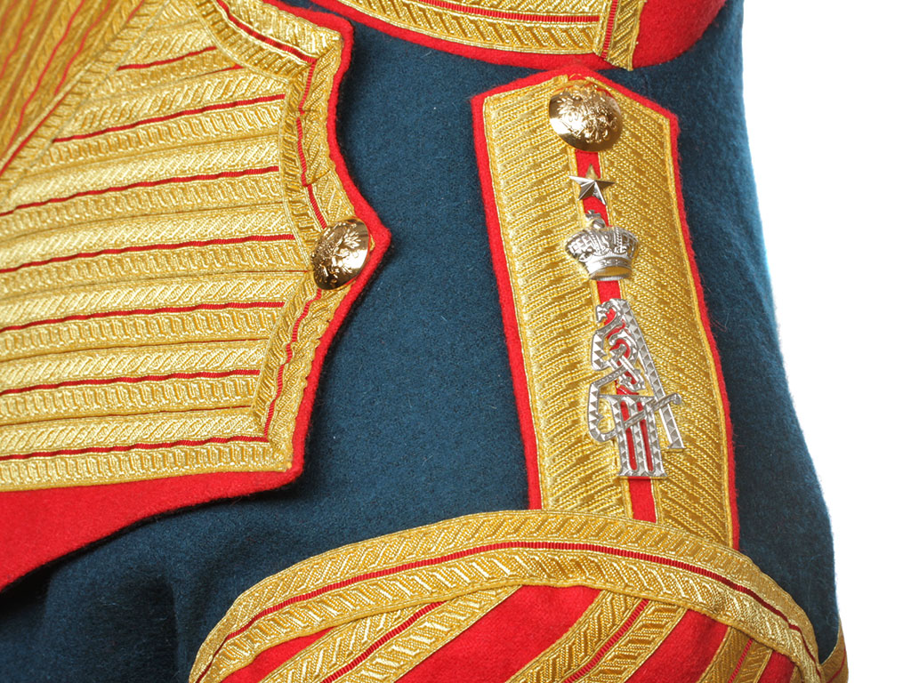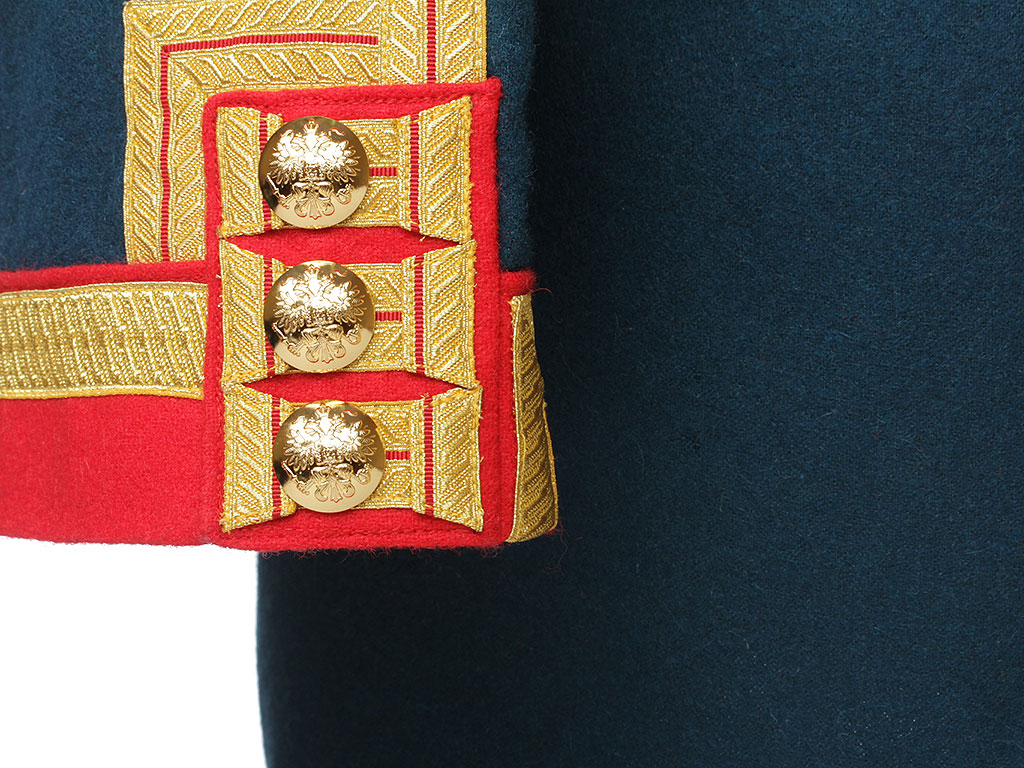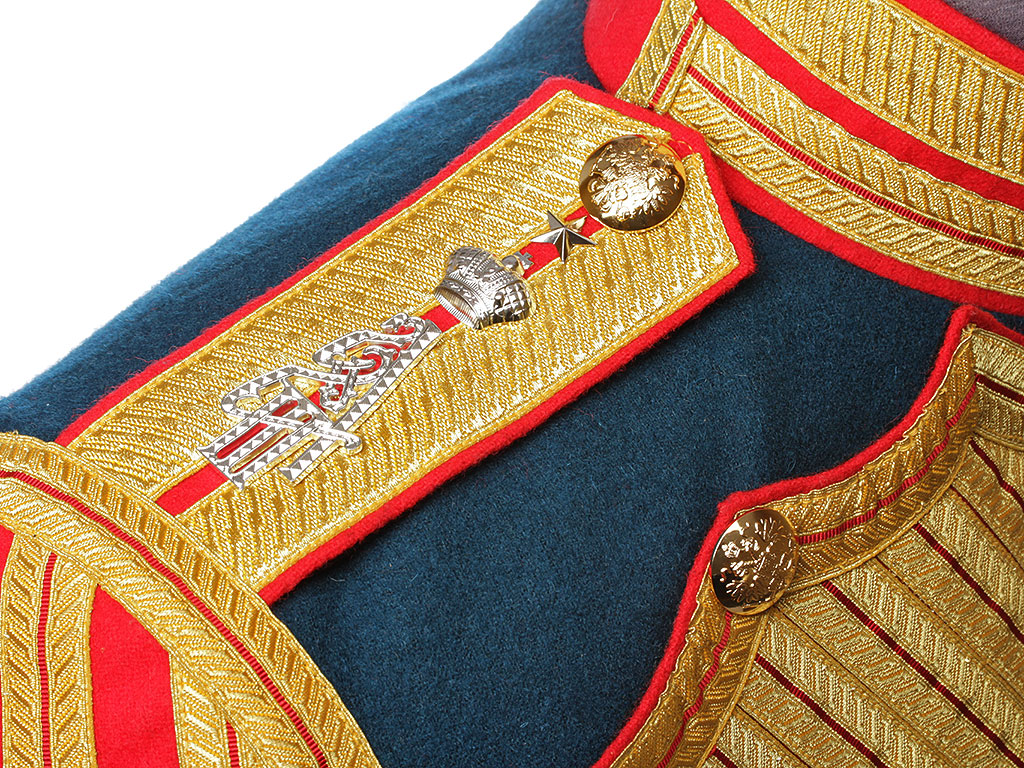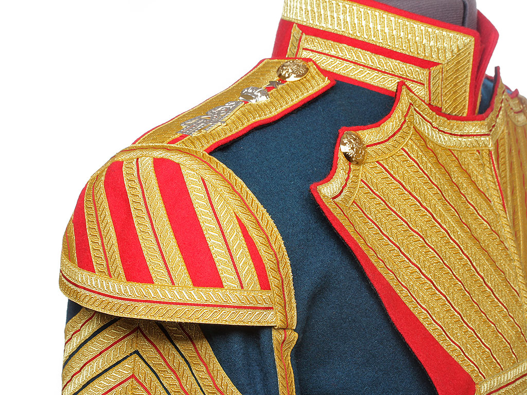 Сами галуны, которыми богато обшит мундир, специально изготовлены для реконструкции данного мундира: они отличаются от стандартного галуна, использовавшегося в армии и гвардии.