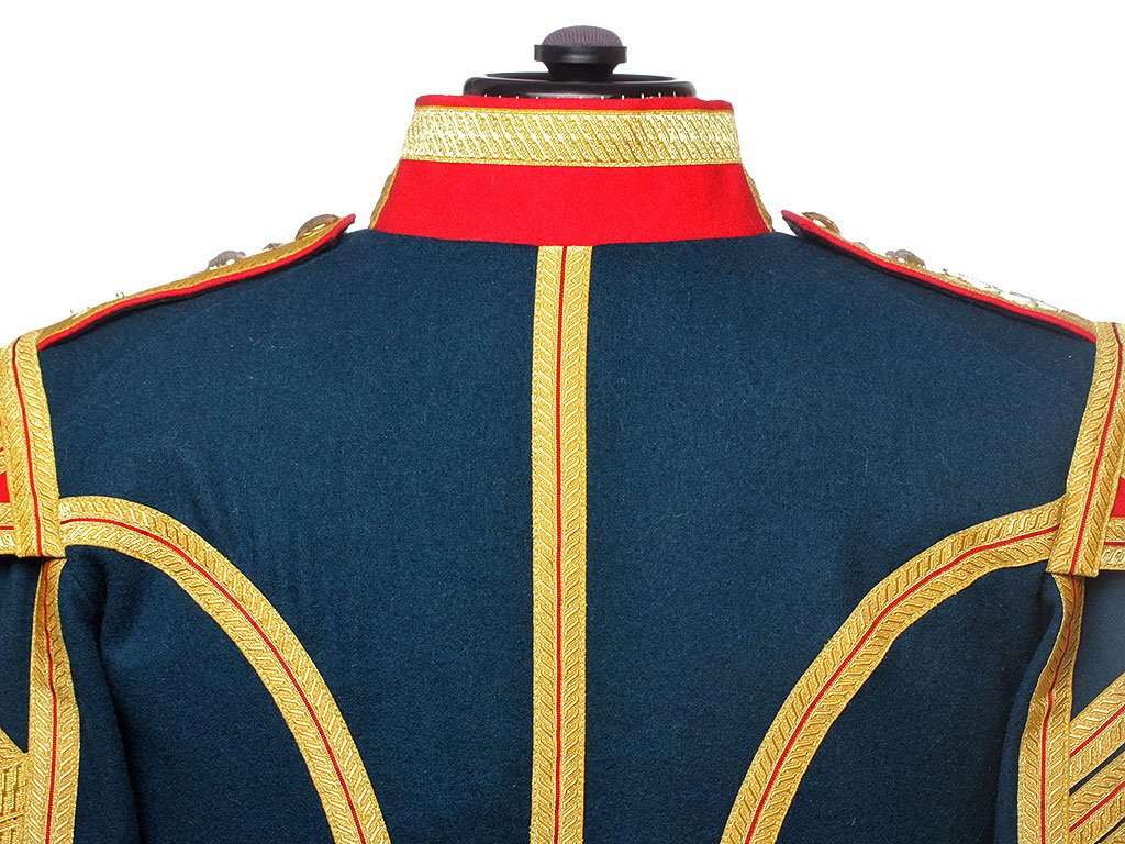 Мундир барабанщика "Золотой роты" (Роты Дворцовых Гренадер - РДГ) - мундир гвардейского лацканного типа. Он напоминает по своей форме мундиры тамбур-мажоров гвардейских пехотных полков, но имеет основные отличия, в первую очередь во внешнем виде галунной обшивки, использовавшейся только в этой Роте, более тонком дорогом пошивочном материале - касторе (при изготовлении копии использовано сукно лазоревого "государева" цвета); отличаются и нашивки за выслугу лет на рукаве в виде трех зототых "галок" из полуштабского галуна, которые были обязательны для всех в роте дворцовых гренадер. Нагрудный лацкан, полностью затянутый пришитыми к нему и соединенными друг с другом галунами, у данного мундира сделан расстегивающимся посередине на крючках (типичное отличие РДГ от Гвардии, где лацкан был пристяжным на пуговицах). Пуговицы пришиты вглухую. Рукава обшиты галунами "на музыкантский манер", что традиционно для более ранних мундиров, а к середине XIX века и позднее осталось только у тамбур-мажоров в некоторых гвардейских полках, а также у барабанщика и флейтистов Роты Дворцовых Гренадер.