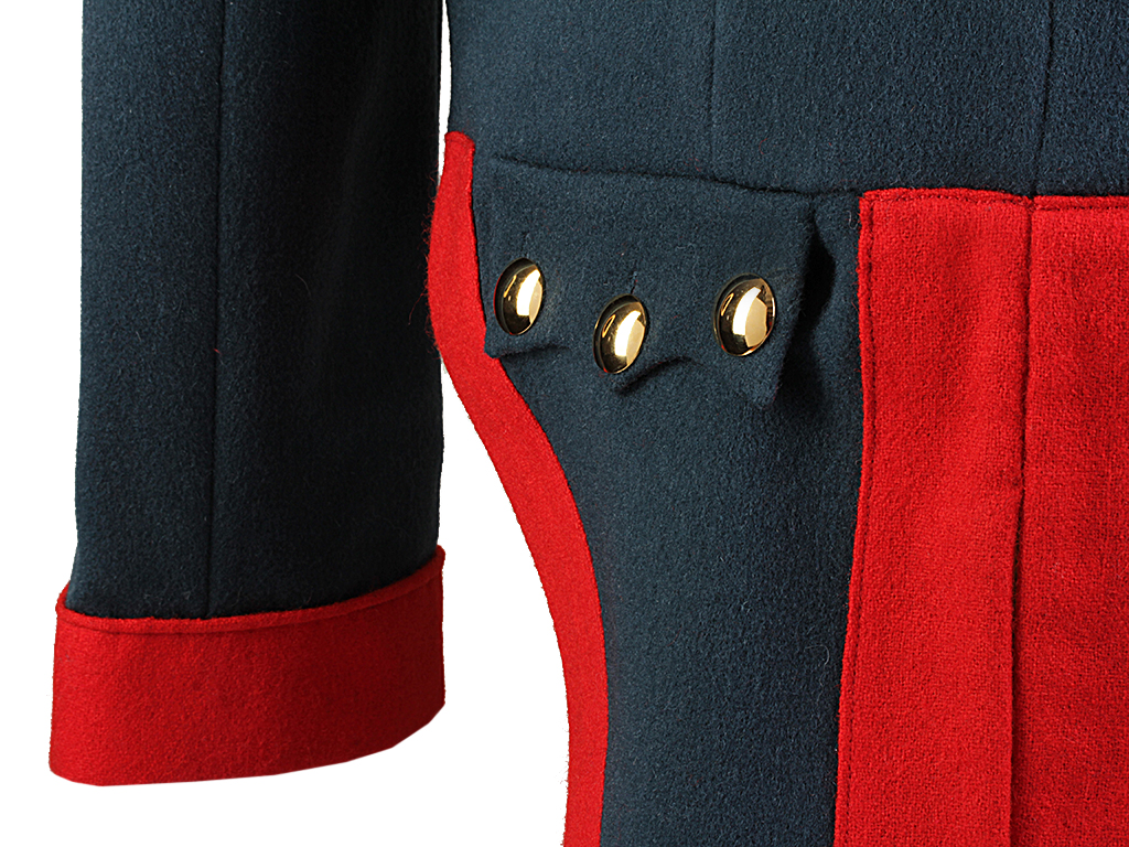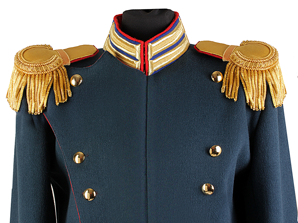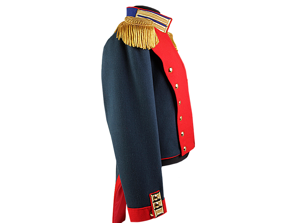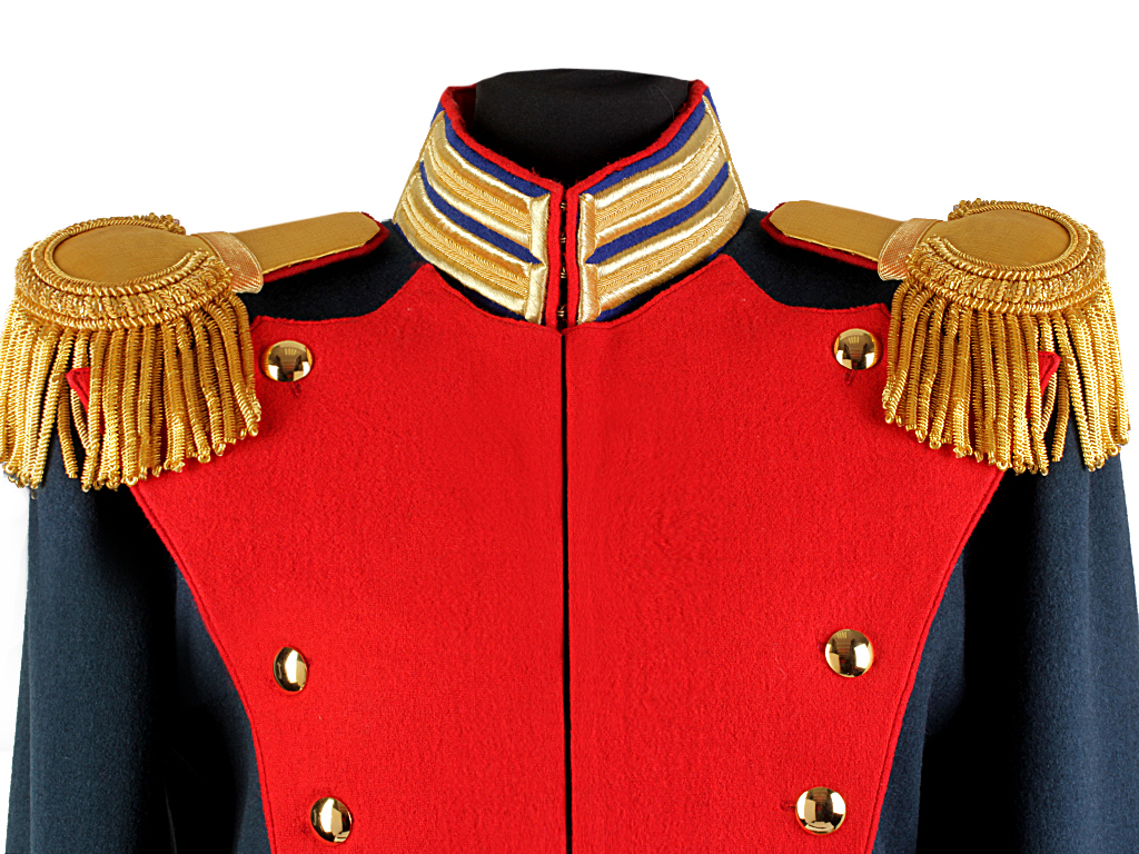 Мундир пошит из сукна "государева цвета" и имеет покрой полуфрака. Застегивается на один прямой ряд стальных крючков. Высокий стоячий воротник из сукна василькового цвета, с золотым шитьем, застегивающийся на четыре крючка, и красным кантом. Лацкан из алого сукна, пристяжной. Все шитье на мундире позолоченное металлизированное. Петлицы лацкана имеют 14 гладких золоченых пуговиц. Эполеты обер-офицерские. Обшлага рукавов красного цвета, с тремя золочеными петлицами и тремя пуговицами (одна из которых "расстегнутая") на каждом рукаве. Полочки на фалдах из красного сукна, с четырьмя золочеными пуговицами. Подкладка из белой саржи.